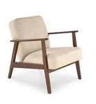 Fotel kubełkowy Fomben beżowy do salonu tapicerowany, wygodny, nowoczesny, drewno bukowe