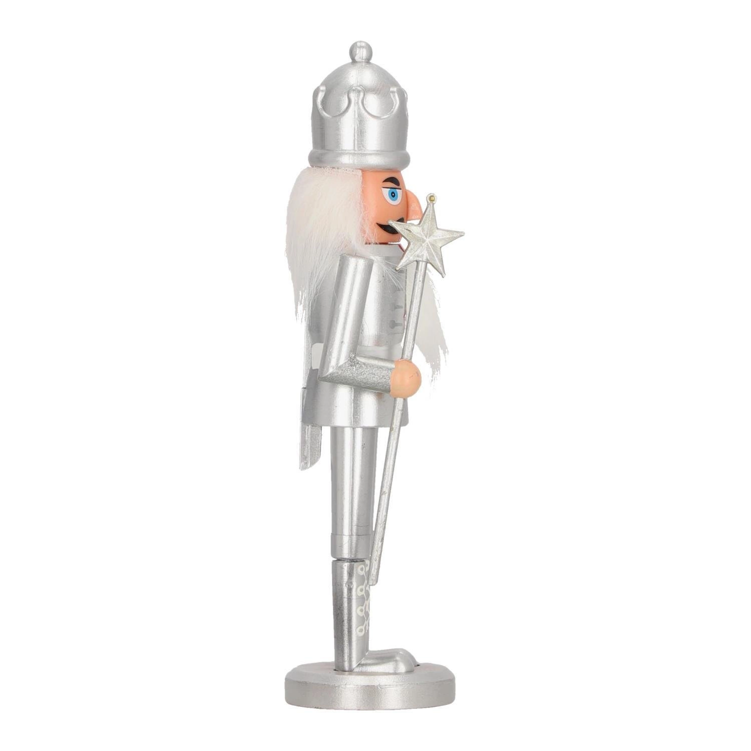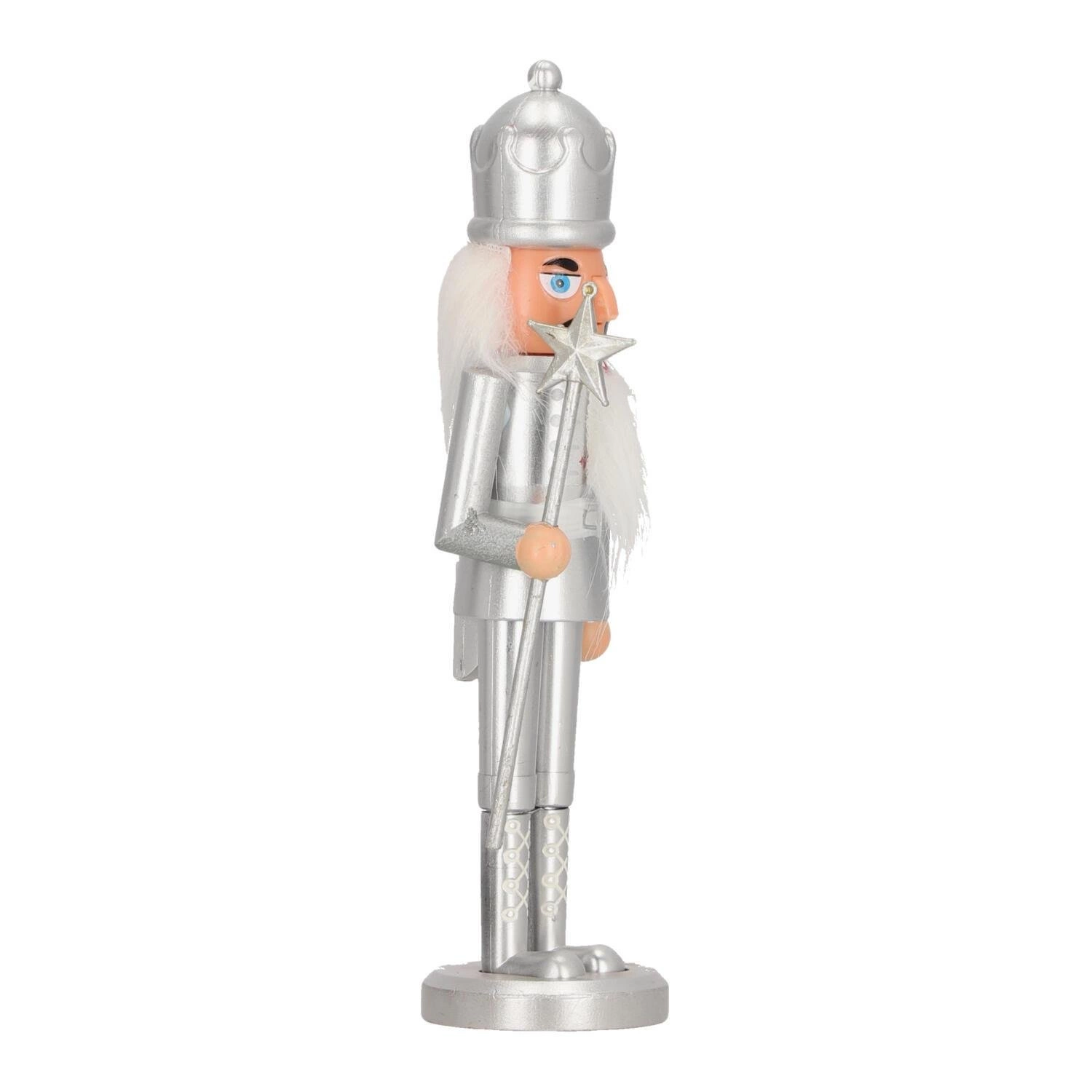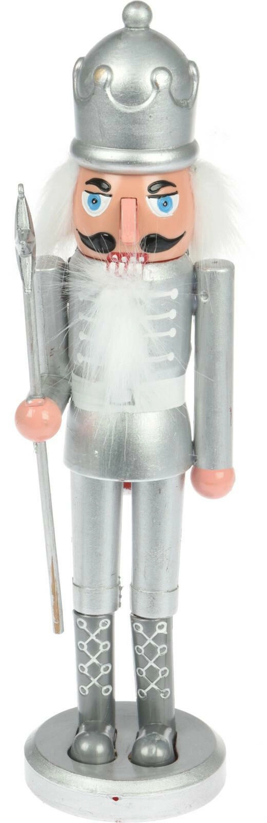 Dekoracja dziadek do orzechów w srebrnym kolorze ze srebrnymi akcentami to hit każdych świąt bożego narodzenia. Sympatyczny żołnierz o puchatych białych włosach skradnie serce domowników. Biało srebrny dziadek do orzechów dopełni świąteczną aranżację. Duży, bo aż 28-centymetrowy, dziadek został zrobiony ze sztucznego tworzywa, dzięki czemu jest wytrzymalszy od jego drewnianych odpowiedników. Dziadek posiada okrągłą podstawkę, dzięki której stoi stabilnie, więc śmiało możemy nim ozdobić stół na świąteczny obiad lub kominek.