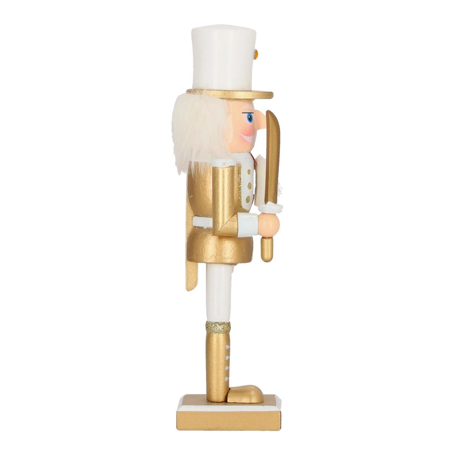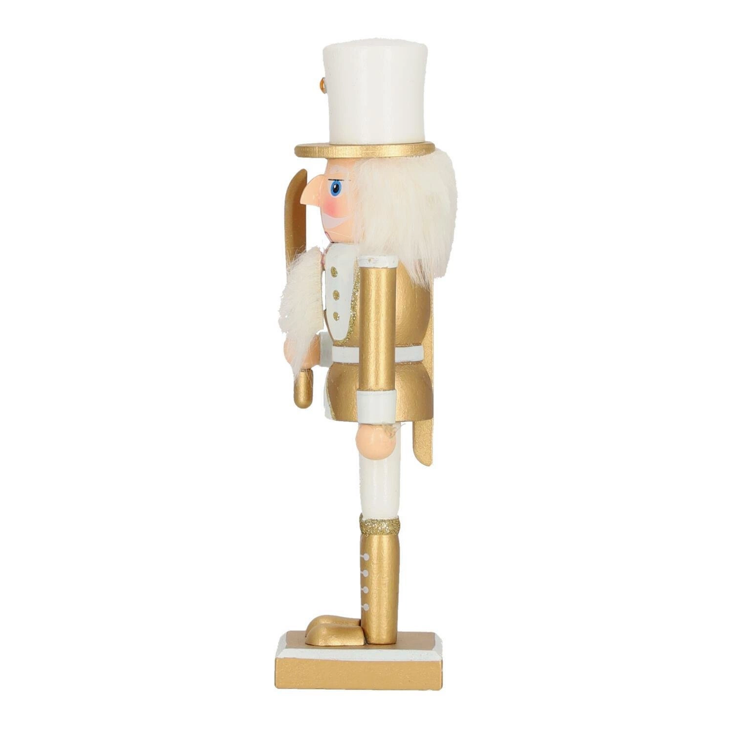 Dekoracja dziadek do orzechów w białym kolorze ze srebrnymi akcentami to hit każdych świąt bożego narodzenia. Sympatyczny żołnierz o puchatych białych włosach skradnie serce domowników. Biało złoty dziadek do orzechów dopełni świąteczną aranżację. Wysoki, na 25-centymetrów, dziadek został zrobiony z drewna sosnowego pomalowanego w świąteczne wzory. Dziadek posiada kwadratową podstawkę, dzięki której stoi stabilnie, więc śmiało możemy nim ozdobić stół na świąteczny obiad lub kominek.