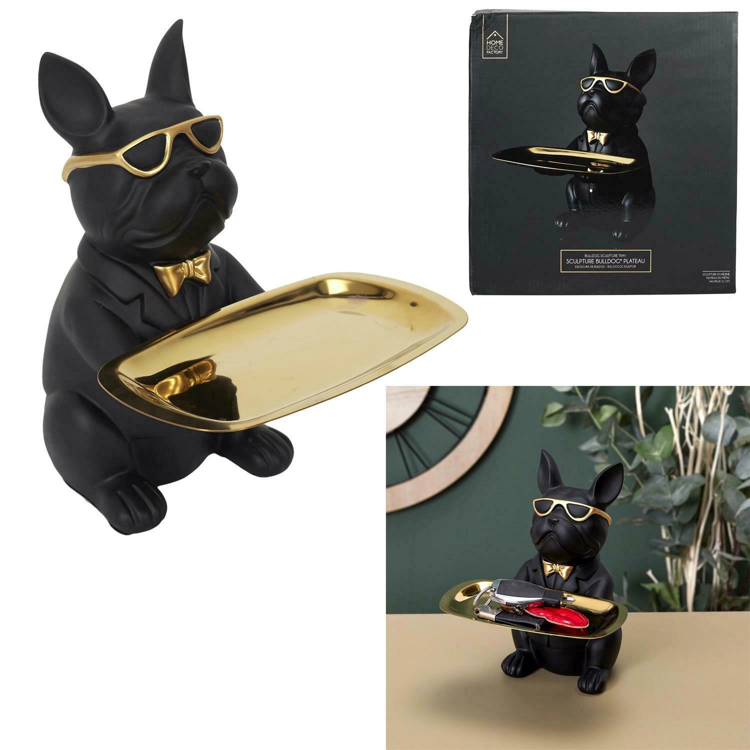Figurka dekoracyjna buldog organizer czarny ze złotą tacą marki Intesi to wyjątkowy akcent do wnętrz w stylu glamour. Wykonana z trwałego tworzywa sztucznego, mierzy 23,5 cm wysokości i 20 cm szerokości, co sprawia, że świetnie prezentuje się zarówno na komodzie, jak i na stoliku w salonie. Połączenie głębokiej czerni z eleganckim, złotym wykończeniem tacy przyciąga wzrok oraz wprowadza do pomieszczenia nutę luksusu i oryginalności.