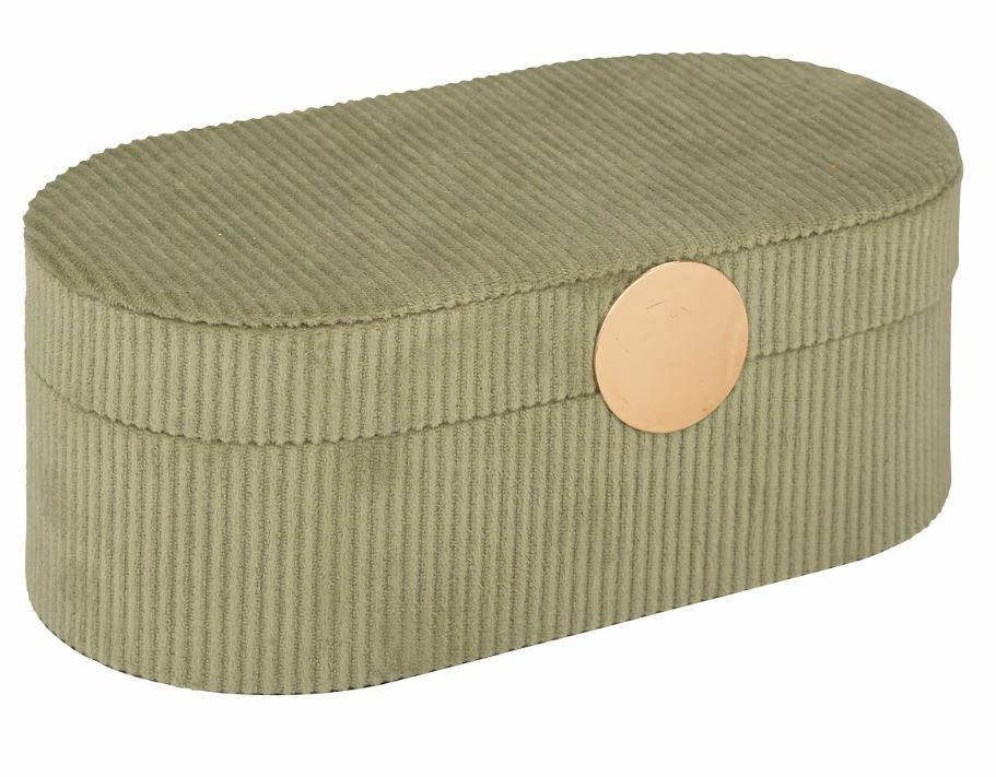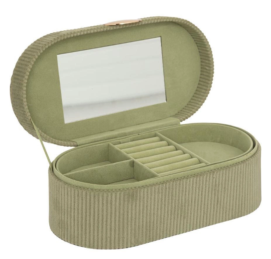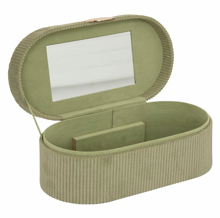 Zielona, sztruksowa szkatułka Enya to idealne rozwiązanie do przechowywania biżuterii w pięknym stylu. Z dużą ilością przegródek na pierścionki, bransoletki i kolczyki, a także z lusterkiem do sprawdzenia swojego wyglądu, ta szkatułka ma wszystko, czego potrzebujesz.