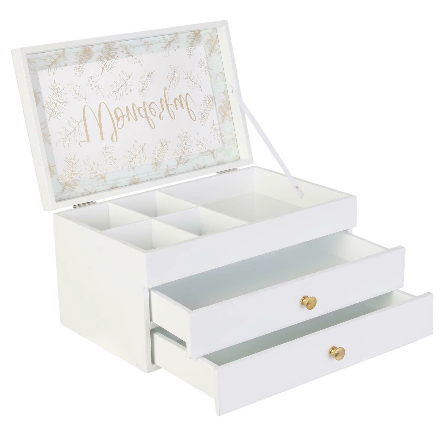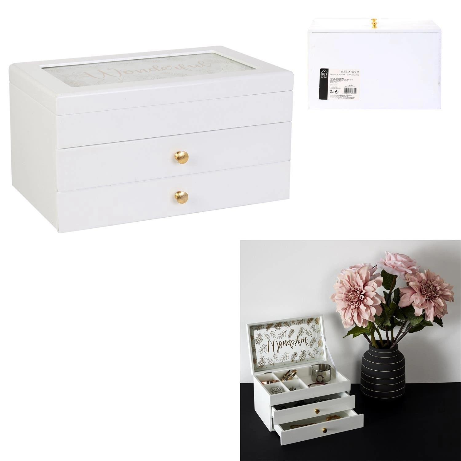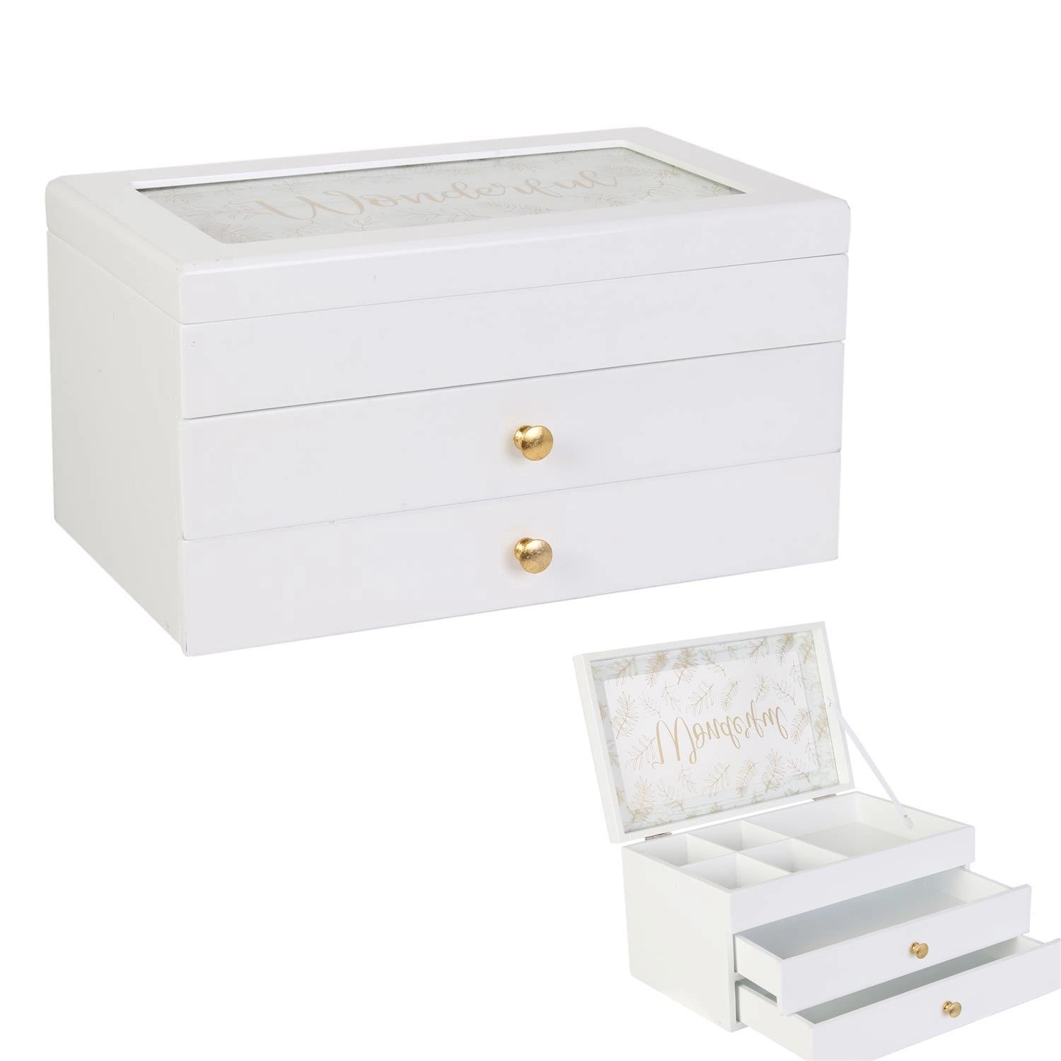 Trzypoziomowa szkatułka na biżuterię wprowadzi porządek i pozwoli nam skutecznie posegregować nasze skarby. Projekt ze szklanym okienkiem w wieczku został ozdobiony złotymi uchwytami i ciekawym napisem na szkle. Pierwszy poziom szkatułki to półka z pięcioma przegródkami, która pozwoli wyeksponować Twoje najpiękniejsze skarby. Kolejne dwa poziomy to szufladki - wszystkie z aksamitną wyściółką, która ochroni naszą biżuterię przed zarysowaniami. Biały kolor pudełka nadaje mu klasyczny wygląd i sprawia, że jest ono idealnym dodatkiem do niemal każdego wnętrza. Szkatułka jest idealna do zorganizowania swojej kolekcji biżuterii, czyniąc je dostępnymi na pierwszy rzut oka, a jednocześnie zachowując ich bezpieczeństwo. Stanie się ona piękną i praktyczną ozdobą każdej sypialni. Połącz funkcjonalność i styl dzięki tej białej szkatułce na biżuterię z szufladami.