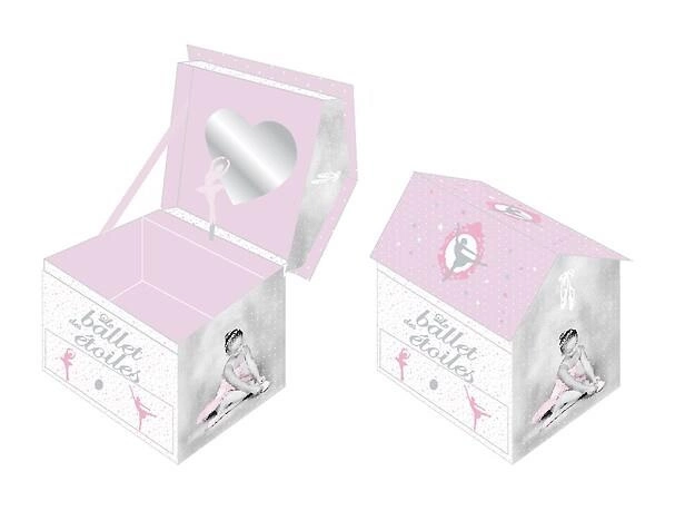Szkatułka z pozytywką to magiczny element wyposażenia pokoju dziewczynki. Różowa szkatułka kryje w sobie szufladkę oraz pojemnik, który jest ukryty pod pokrywką w kształcie dwuspadowego dachu. Wewnątrz szkatułki znajduje się lusterko w kształcie serca.