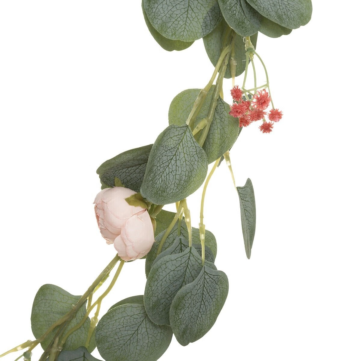 Długość 130 cm sprawia, że girlanda świetnie prezentuje się zarówno na ścianie, jak i jako ozdoba stołu, komody czy balustrady. Jej subtelna forma i neutralny, zielony kolor doskonale komponują się z nowoczesnymi aranżacjami oraz dodatkami w stylu boho. Sztuczne kwiaty i liście nie więdną ani nie tracą intensywności barw, dzięki czemu girlanda pozostaje efektowna nawet w miejscach o ograniczonym dostępie do światła, takich jak łazienka, korytarz czy kawiarnia.
