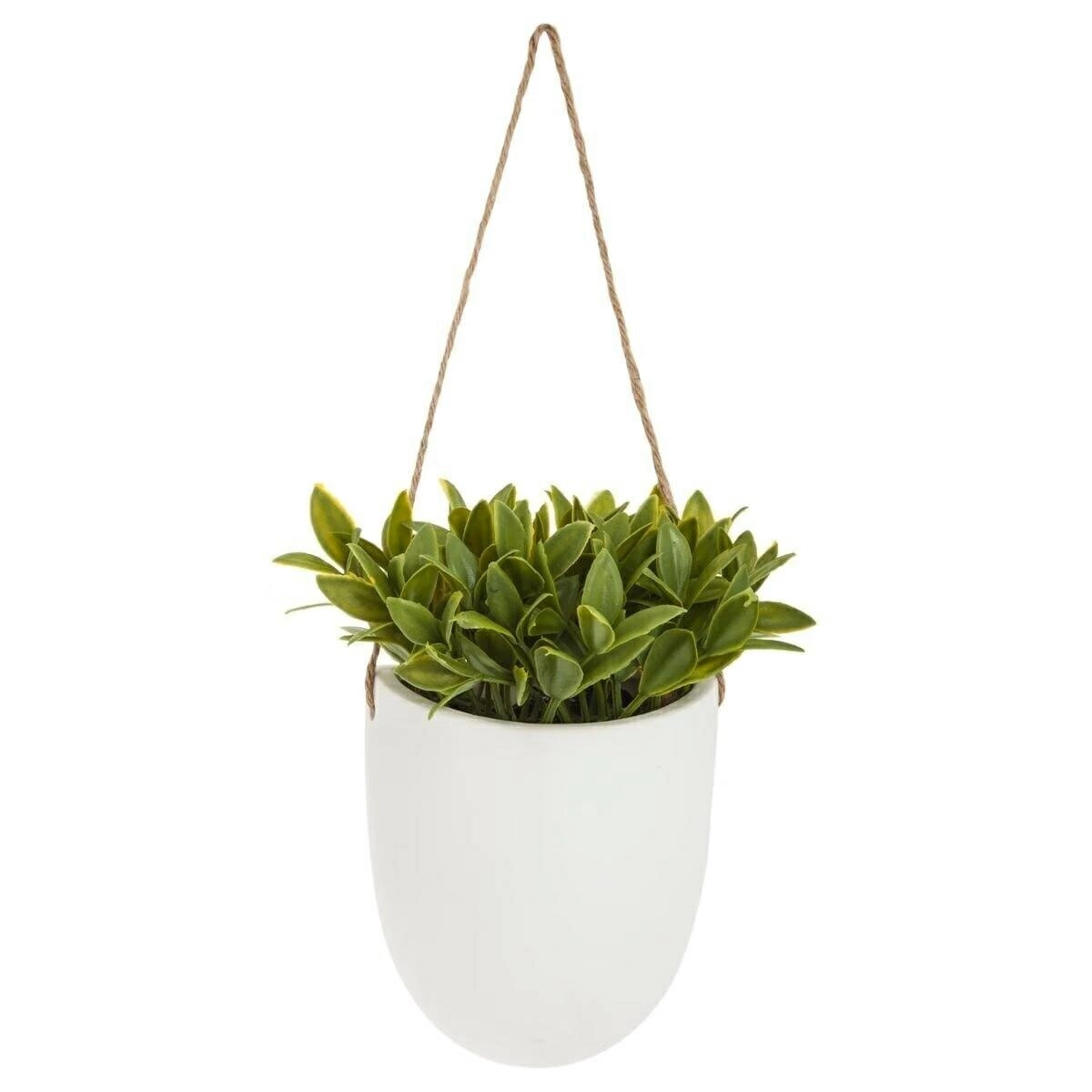 Sztuczna roślina wisząca jasna to oryginalny element dekoracyjny, który doskonale wpasuje się w romantyczne i bukoliczne wnętrza. Ta wisząca roślina charakteryzuje się eleganckim ceramicznym pojemnikiem z subtelnie zakrzywionym kształtem oraz płaskim tyłem, umożliwiającym łatwe przymocowanie do ściany. Dzięki zastosowaniu jutowej liny, roślina nie tylko wygląda estetycznie, ale także dodaje naturalnego uroku każdej przestrzeni.