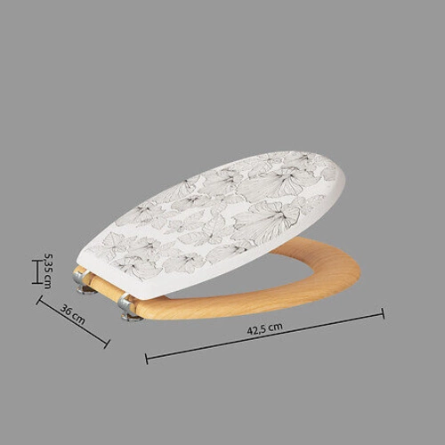 Deska sedesowa Blackflora została wyposażona w chrpmowane zawiasy, które są eleganckie i ponadczasowe. Dzięki temu rozwiązaniu korzystanie z toalety jest ciche, a powierzchnia ceramiki pozostaje wolna od uszkodzeń. Owalny kształt deski (36 cm szerokości i 42,5 cm głębokości) sprawia, że pasuje do większości standardowych misek WC, zapewniając wygodę każdemu domownikowi.