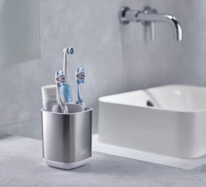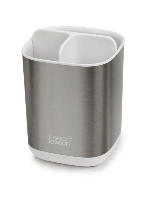 Każdy poranek rozpoczynający się od poszukiwania szczoteczki do zębów potrafi zepsuć humor. Dzięki pojemnikowi Joseph Joseph EasyStore Steel zyskujesz praktyczny kubek na szczoteczki, który pozwala utrzymać idealny porządek na umywalce. Wnętrze pojemnika posiada wygodne przegrody, które oddzielają szczoteczki od pasty do zębów, zapobiegając ich mieszaniu się. To rozwiązanie, które sprawia, że każdy z domowników ma swoje miejsce na szczoteczkę, a całość prezentuje się estetycznie i schludnie.