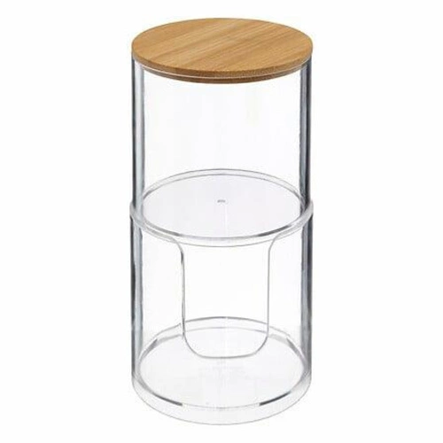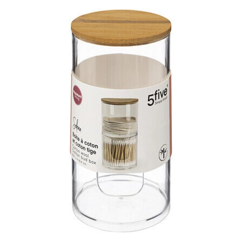 Organizer na waciki i patyczki Selena marki 5five simply smart to połączenie transparentnego, trwałego pojemnika z elegancką bambusową pokrywką. Cylindryczny kształt i kompaktowy rozmiar (wysokość 18,1 cm, średnica 9,7 cm) sprawiają, że organizer świetnie prezentuje się na łazienkowej półce, toaletce lub w szufladzie. Doskonale sprawdzi się jako organizer na kosmetyki do łazienki, pomagając utrzymać porządek i estetykę każdej przestrzeni.