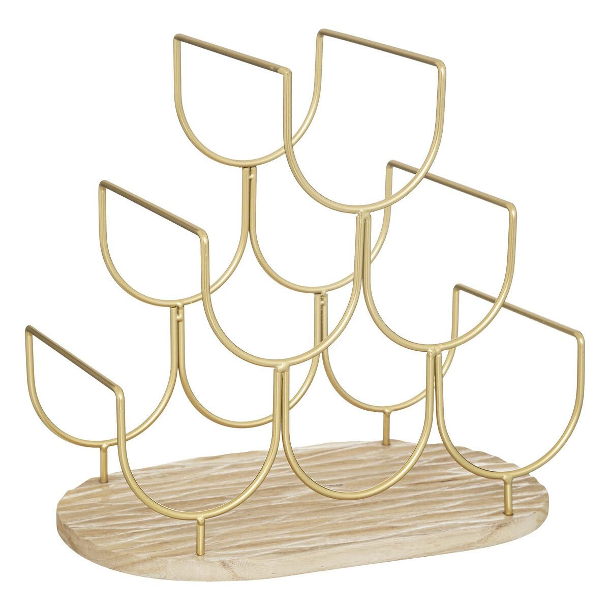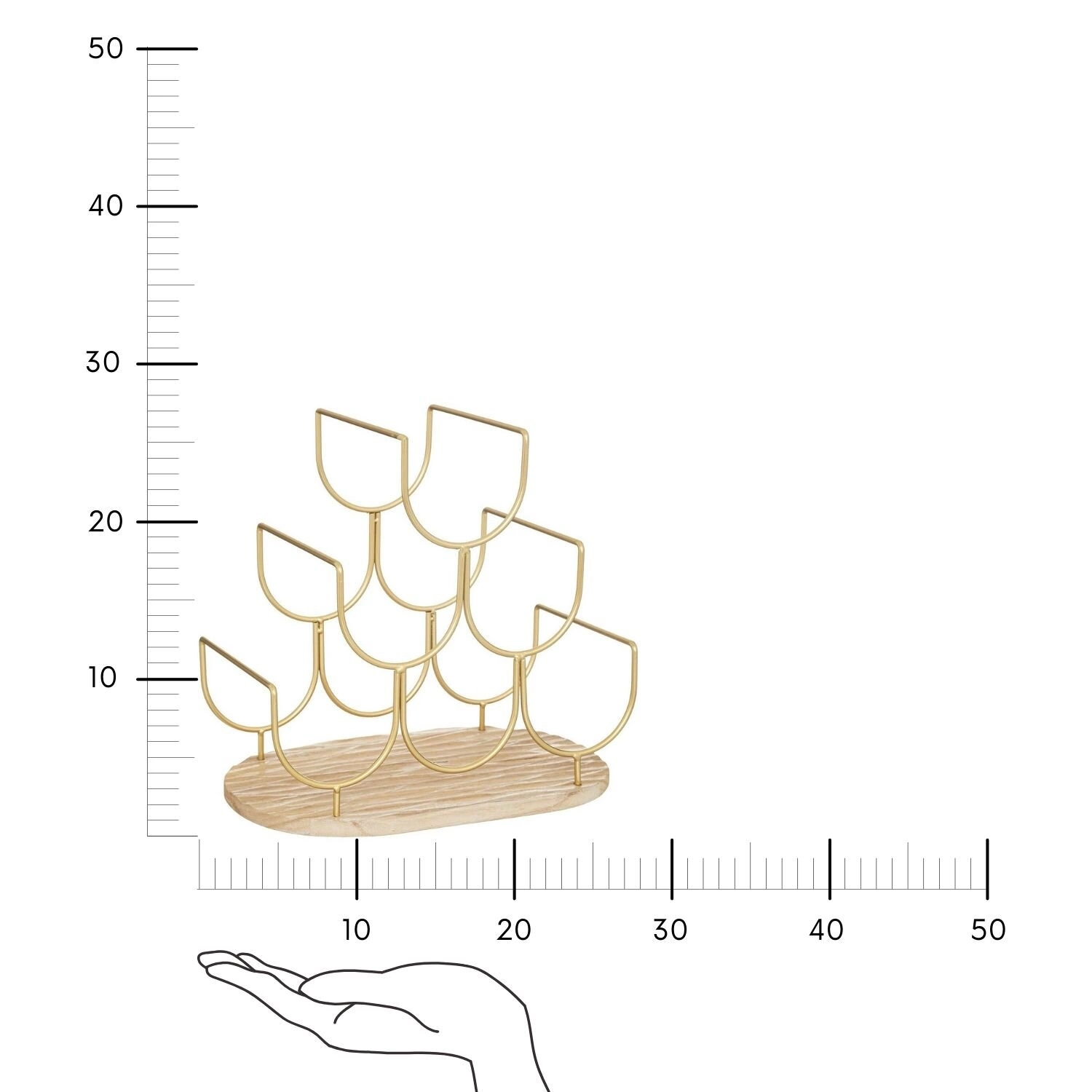 Metalowe wsporniki w kolorze złotym dodają stojakowi elegancji i luksusowego wyglądu. Złoty kolor wsporników pięknie kontrastuje z drewnianą podstawą, tworząc harmonijną kompozycję, która przyciąga wzrok i dodaje szyku każdemu pomieszczeniu. Jedną z największych zalet stojaka Rivi jest jego funkcjonalność. Dzięki liczbie miejsc na butelki wynoszącej 6, możesz wyeksponować swoje ulubione roczniki i mieć je zawsze pod ręką. Nie musisz już szukać miejsca w szafce czy spiżarni, teraz Twoje wino może być dumnie prezentowane na meblu lub stole konsolowym.