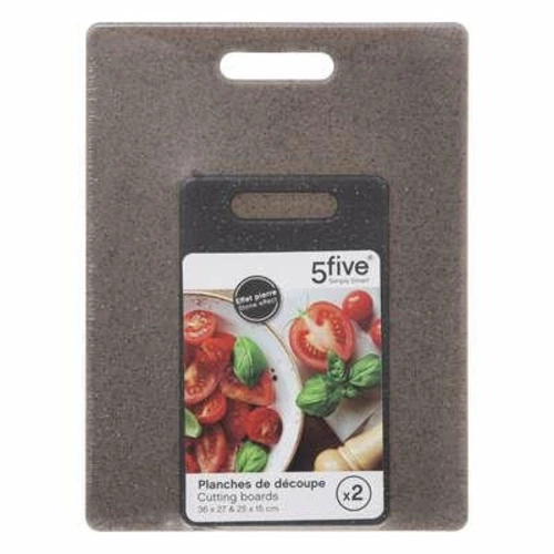 Zestaw 2 czarnych desek do krojenia z efektem kamienia marki 5five simply smart to funkcjonalne i stylowe rozwiązanie do każdej kuchni. Wykonane z trwałego tworzywa sztucznego, prostokątne deski w dwóch rozmiarach (36,4 × 27,5 cm oraz 25 × 15 cm, grubość 0,8 cm) sprawdzą się zarówno do codziennego krojenia warzyw, mięsa, jak i do estetycznego serwowania przekąsek. Ich matowa, kamienna faktura nadaje nowoczesny charakter, a czarny kolor pasuje do rozmaitych aranżacji kuchennych.
