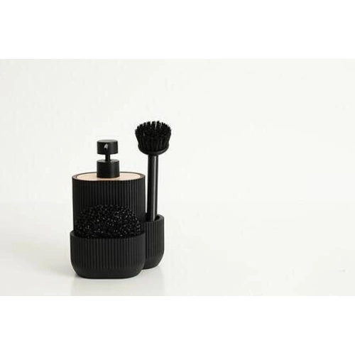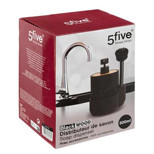Dozownik na płyn do naczyń Blackwood marki 5five simply smart to praktyczne i stylowe rozwiązanie do każdej nowoczesnej kuchni. Wyróżnia go elegancka czarna kolorystyka, kompaktowy rozmiar (wysokość 18 cm, szerokość 13,5 cm, głębokość 12,5 cm) oraz zestaw z gąbką i szczotką. Wykonany z trwałego tworzywa sztucznego, ułatwia codzienne zmywanie i organizację przestrzeni przy zlewie.