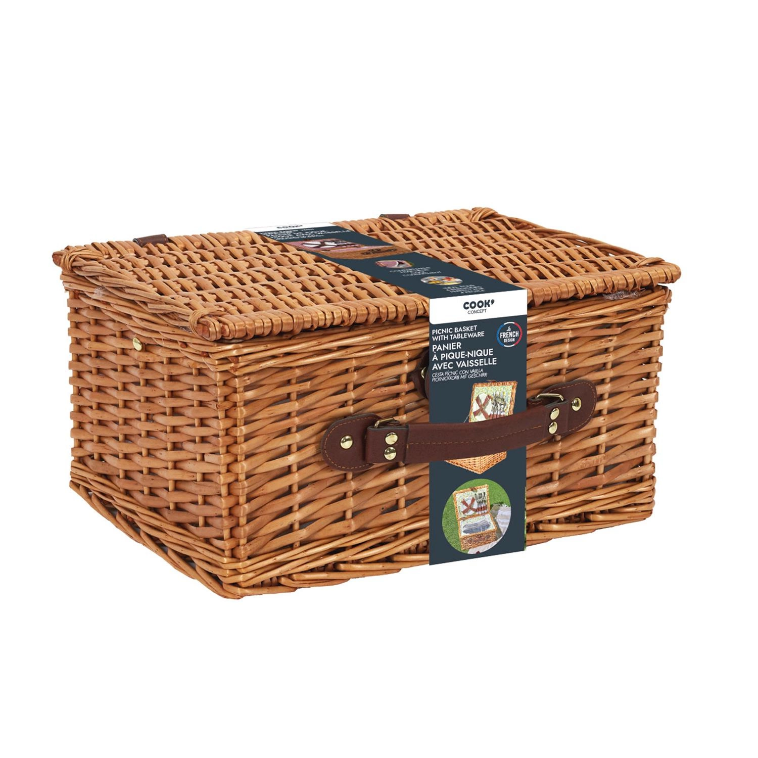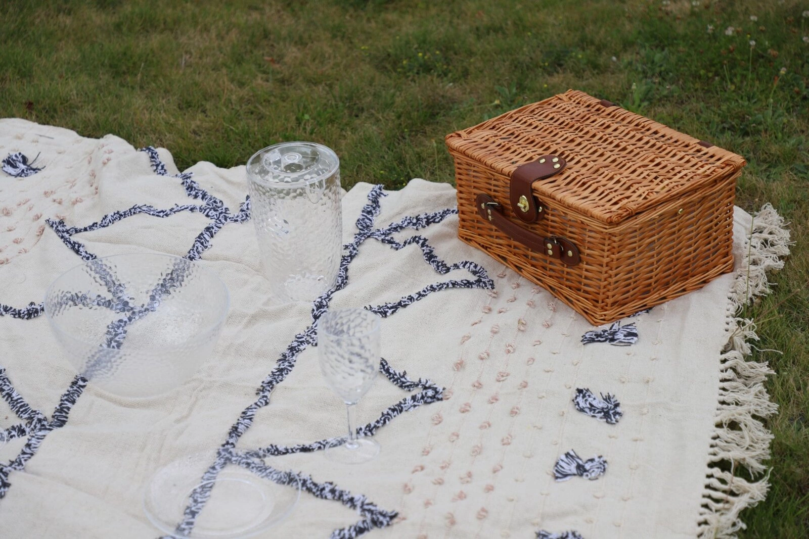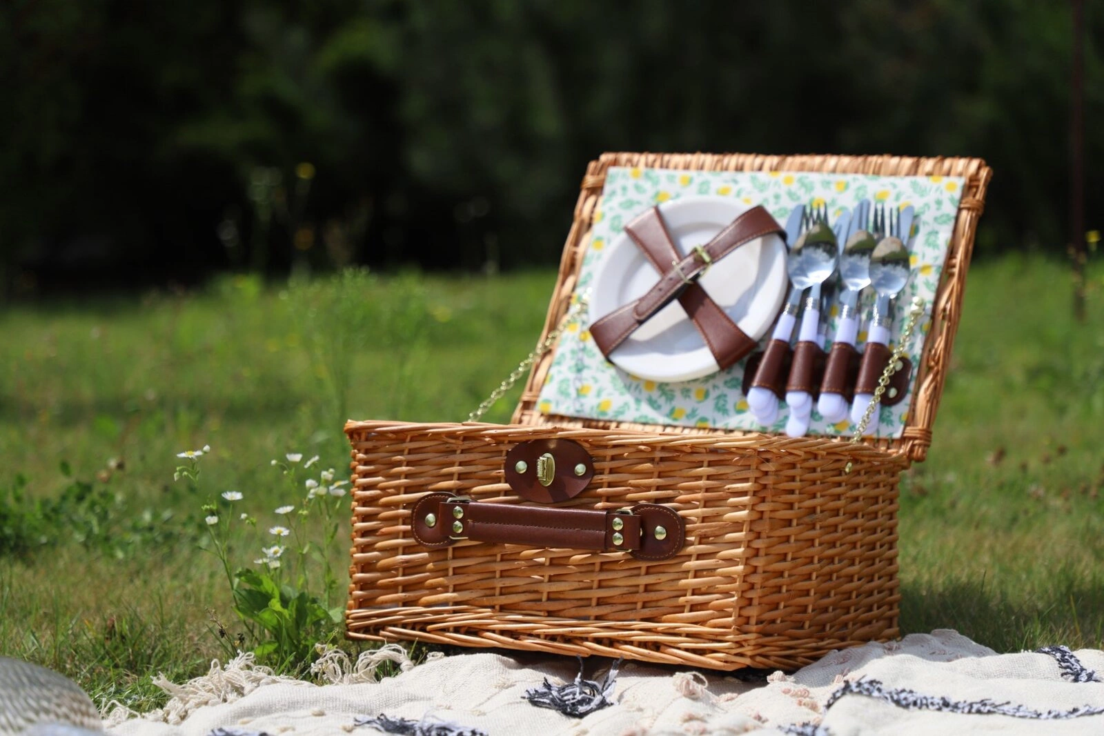 Kosz piknikowy jest wykonany z wytrzymałych materiałów, takich jak plecionka, stal nierdzewna i tworzywo sztuczne, co gwarantuje jego trwałość i estetyczny wygląd. Uchwyt z eko skóry ułatwia przenoszenie kosza, a solidne zamknięcie zapewnia bezpieczne przechowywanie zawartości. Kiedy kosz nie jest używany, może służyć jako elegancka dekoracja w domu, wnosząc element naturalnego uroku dzięki swojej plecionej obudowie.
