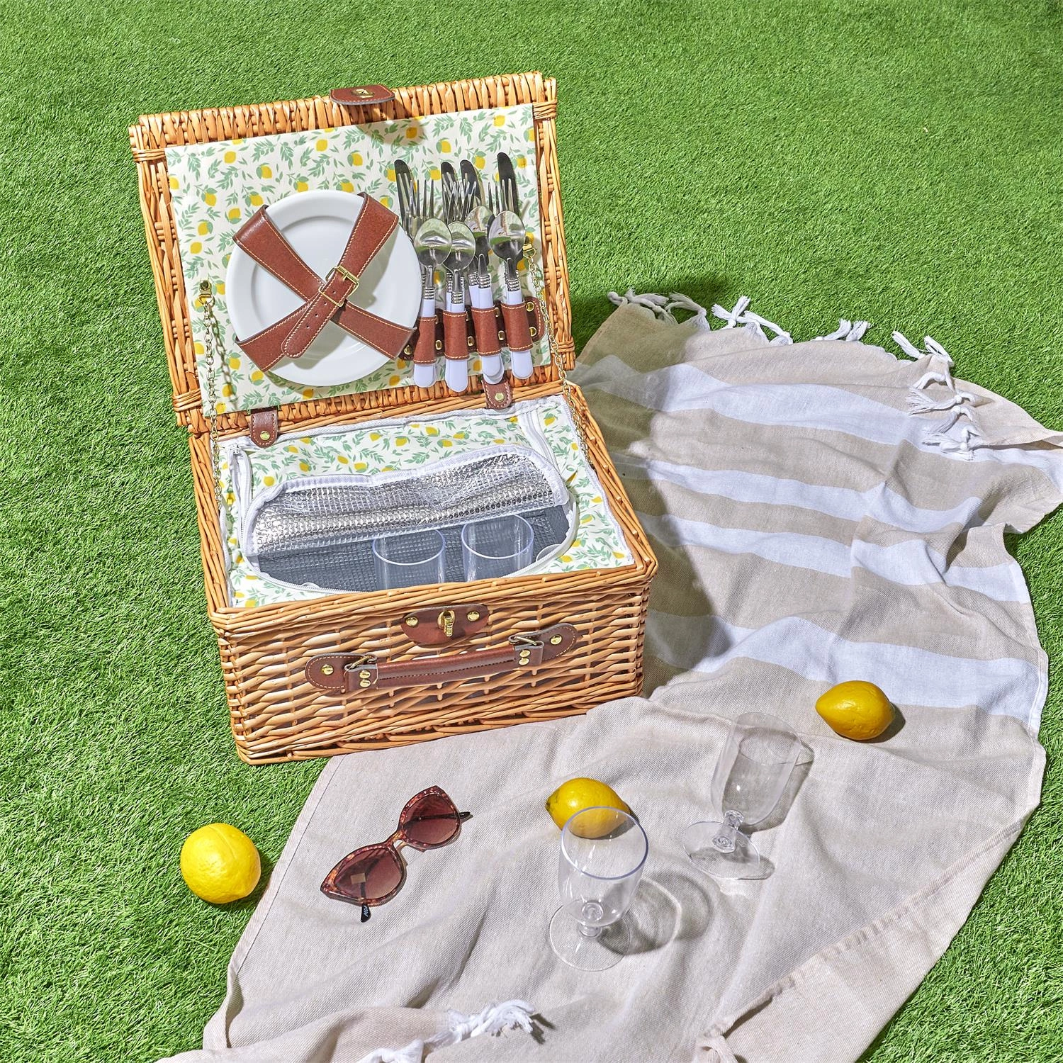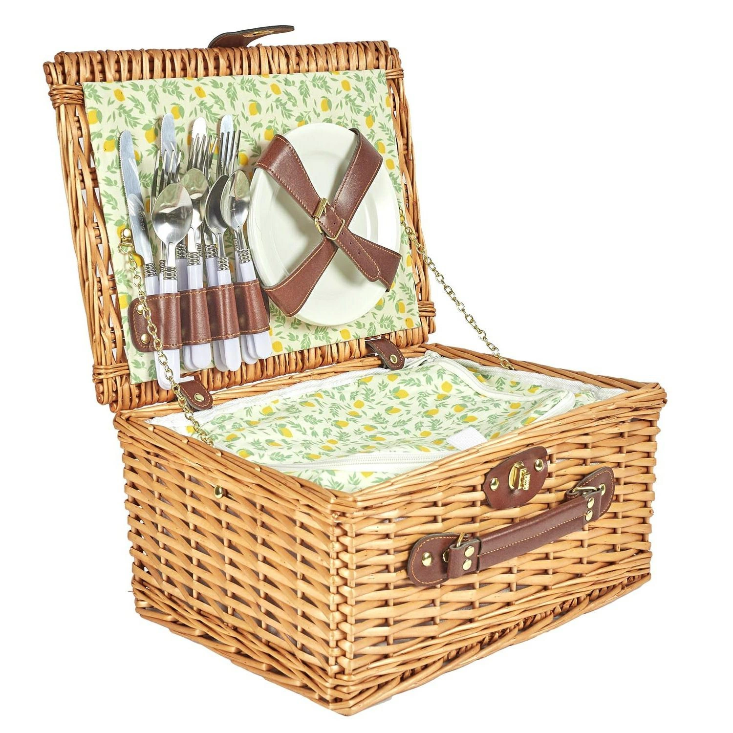 Kosz piknikowy dla czterech osób to idealne rozwiązanie na niedzielne wypady za miasto, rodzinne pikniki czy romantyczne wycieczki. Elegancko zaprojektowany, wyściełany tkaniną z letnimi motywami, kosz ten nie tylko ułatwia organizację posiłków na świeżym powietrzu, ale także dodaje stylu każdej okazji. Wnętrze kosza jest starannie zorganizowane, zawierając komplet sztućców i talerzy dla czterech osób, co pozwala na komfortowy i swobodny posiłek w plenerze.