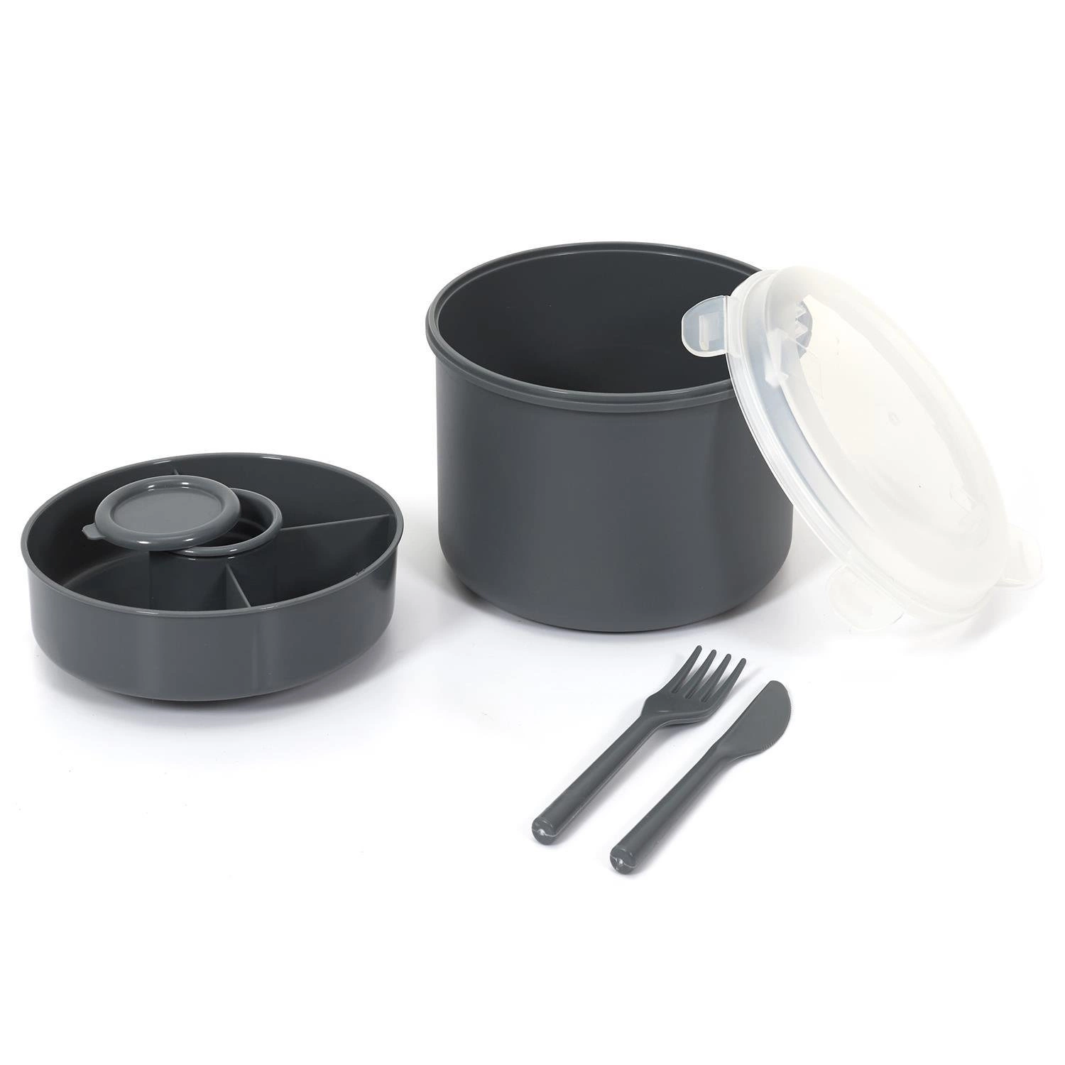 Lunchbox Round Intesi 1,4l to praktyczny pojemnik na lunch wykonany z wytrzymałego tworzywa sztucznego, wyróżniający się antracytowym kolorem oraz nowoczesnym, okrągłym kształtem. Dzięki przegródkom i dołączonym sztućcom idealnie sprawdzi się jako śniadaniówka do pracy lub szkoły. Kompaktowa forma o średnicy 17 cm i wysokości 13 cm pozwala wygodnie przenosić różnorodne posiłki, zachowując ich świeżość przez cały dzień.