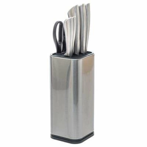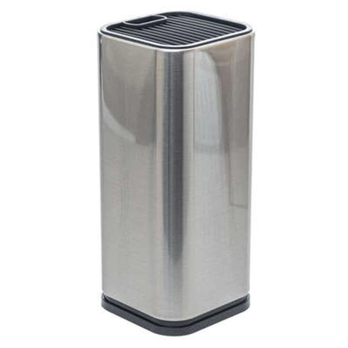 Metalowy stojak o wymiarach 10 × 10 × 36,3 cm gwarantuje stabilność i estetykę, a nowoczesne zestawienie srebrnych ostrzy z czarnymi detalami doskonale komponuje się zarówno z jasnymi, jak i ciemnymi kuchniami. Wytrzymała stal nierdzewna sprawia, że noże zachowują ostrość na długo i są odporne na korozję, co ułatwia utrzymanie ich w czystości nawet przy codziennym użytkowaniu.