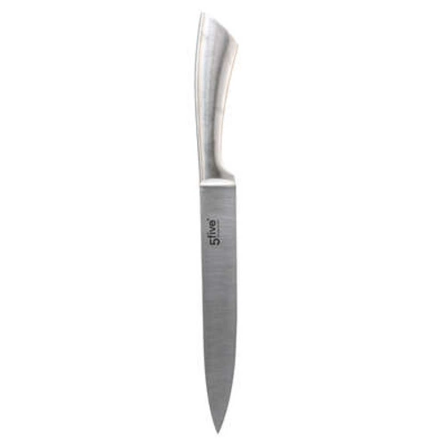 Zestaw noży kuchennych stalowych z metalowym stojakiem 5five simply smart to praktyczne i stylowe rozwiązanie dla każdego miłośnika gotowania. Komplet obejmuje pięć noży przeznaczonych do chleba i warzyw, które dzięki ostrym stalowym ostrzom umożliwiają szybkie i precyzyjne krojenie. Całość prezentuje się elegancko dzięki połączeniu srebrnych i czarnych akcentów oraz solidnej, metalowej podstawie o wysokości 36,3 cm, stanowiącej nie tylko wygodny organizer, ale także ozdobę każdej kuchni.