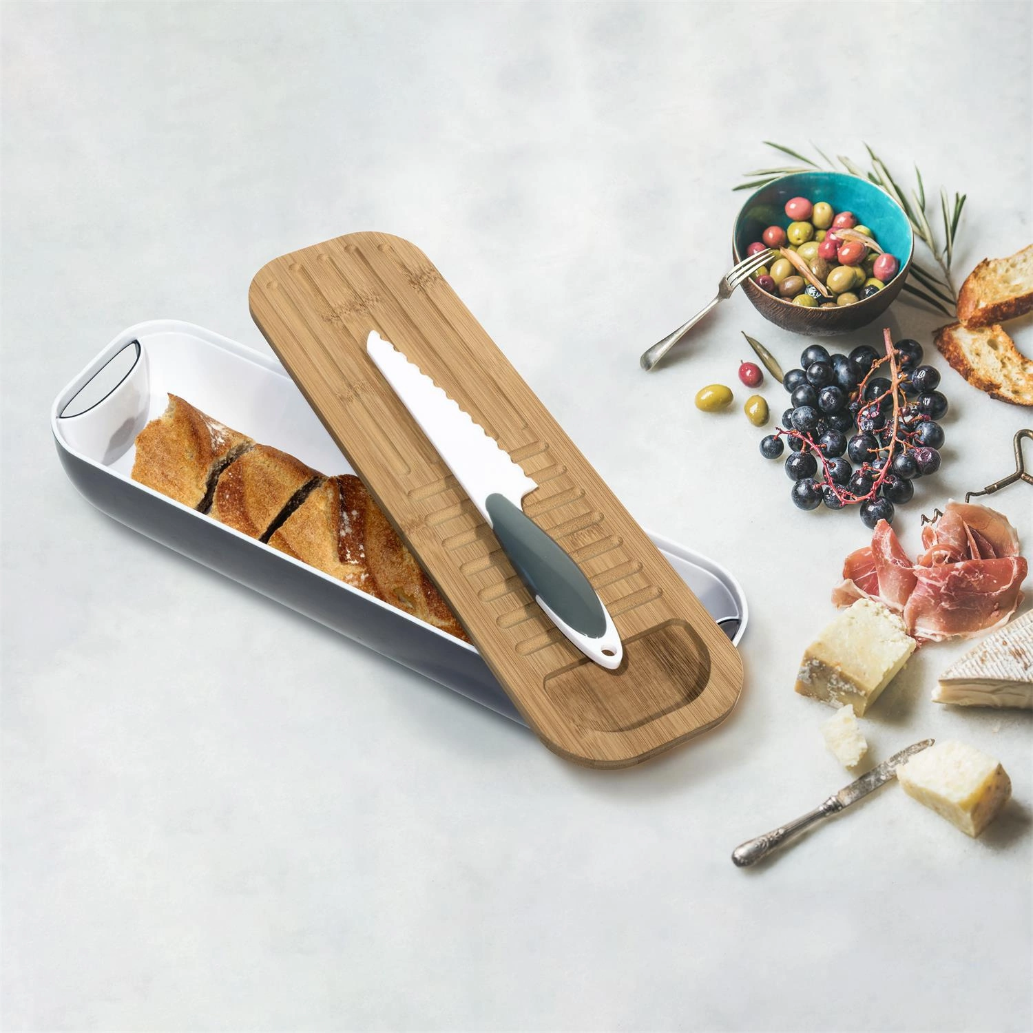 Zestaw 3w1 Intesi został zaprojektowany z myślą o maksymalnej wygodzie. Dedykowany nóż sprawia, że masz zawsze pod ręką odpowiednie narzędzie do krojenia, nie tracąc czasu na szukanie ostrza w szufladzie. Wysokość pojemnika (9,5 cm) pozwala na przechowywanie różnych rodzajów pieczywa, a kompaktowa głębokość (12,5 cm) nie zajmuje dużo miejsca na blacie.