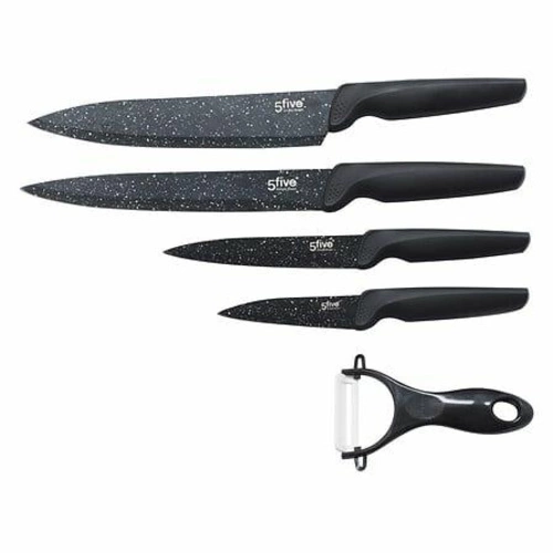 W zestawie Caractere marki 5five simply smart znajdziesz noże, które odpowiadają na wszystkie codzienne potrzeby w kuchni. Nóż szefa kuchni doskonale sprawdzi się do krojenia mięsa i warzyw, nóż uniwersalny poradzi sobie zarówno z pieczywem, jak i drobnymi owocami, nóż do obierania umożliwi szybkie przygotowanie warzyw, a nóż do krojenia ułatwi porcjowanie składników na sałatki czy kanapki. Uzupełnieniem zestawu jest ceramiczna obieraczka, która pozwala na sprawne i bezpieczne obieranie nawet najdelikatniejszych warzyw i owoców.