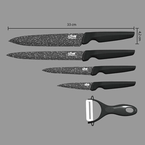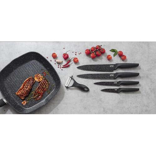 Minimalistyczny, czarny kolor zestawu nadaje mu wyjątkowej elegancji, sprawiając, że świetnie wpisuje się zarówno w nowoczesne, jak i klasyczne aranżacje kuchenne. Noże wykonane z wysokiej jakości stali nierdzewnej pokrytej ceramiczną powłoką są odporne na korozję i przebarwienia, co przekłada się na ich długowieczność. Lekka konstrukcja i dobrze wyprofilowane rękojeści zapewniają pewny chwyt oraz komfort użytkowania nawet podczas intensywnego gotowania.