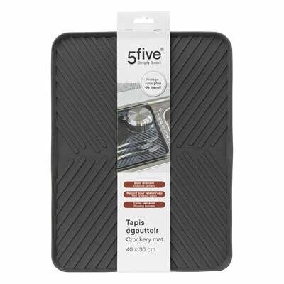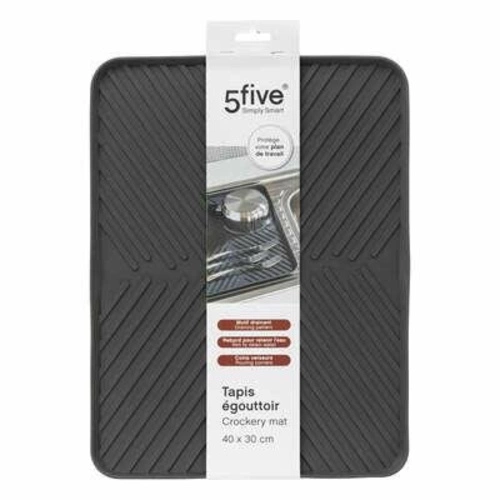 Czarna mata ociekacz do naczyń 5five simply smart to praktyczne rozwiązanie na blat kuchenny, które łączy minimalistyczny design z funkcjonalnością. Wykonana z elastycznego kauczuku termoplastycznego, prostokątna i przestronna (40,5 × 30,5 cm), doskonale sprawdzi się jako silikonowa mata do suszenia naczyń. Dzięki specjalnym rowkom skutecznie odprowadza wodę, zapewniając szybkie i higieniczne schnięcie naczyń oraz ochronę blatu przed wilgocią.