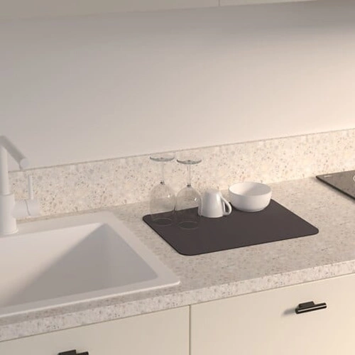 Szary, stonowany kolor maty ociekacza na naczynia świetnie wpisuje się w nowoczesne trendy aranżacji wnętrz. Prostokątny kształt i smukła forma (zaledwie 0,3 cm grubości) sprawiają, że mata prezentuje się elegancko i nie zabiera cennego miejsca na blacie. To doskonały wybór zarówno do małych kuchni, jak i przestronnych aneksów – zawsze pod ręką, gdy potrzebujesz skutecznie osuszyć naczynia.