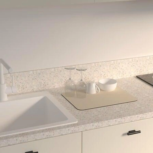 Uniwersalny, beżowy kolor sprawia, że mata ociekacz do naczyń doskonale wpisuje się zarówno w nowoczesne, jak i klasyczne aranżacje wnętrz. Prostokątny kształt oraz niska grubość (0,3 cm) pozwalają łatwo dopasować ją do większości blatów kuchennych lub wykorzystać jako podkładkę pod suszarkę. Subtelny odcień beżu nie dominuje we wnętrzu, a jednocześnie wprowadza do kuchni lekkość i harmonię.