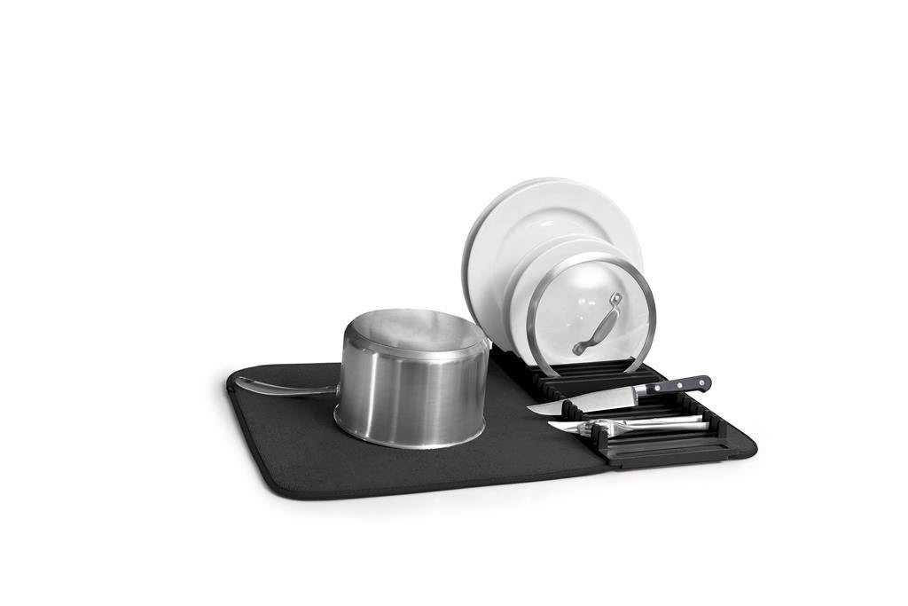 UDRY nowoczesna mata ociekacz do naczyń marki Umbra to praktyczne i stylowe rozwiązanie dla osób, które cenią porządek i wygodę w kuchni. Wykonana z lekkiej, superchłonnej mikrofibry oraz trwałego tworzywa sztucznego, mata o wymiarach 60×46 cm skutecznie pochłania wodę i zabezpiecza blat kuchenny przed wilgocią. Jej głównym atutem jest innowacyjne połączenie maty z podstawką na naczynia, dzięki czemu świetnie sprawdzi się zarówno jako mata do suszenia naczyń, jak i jako praktyczny ociekacz na talerze czy kubki.