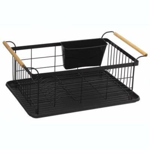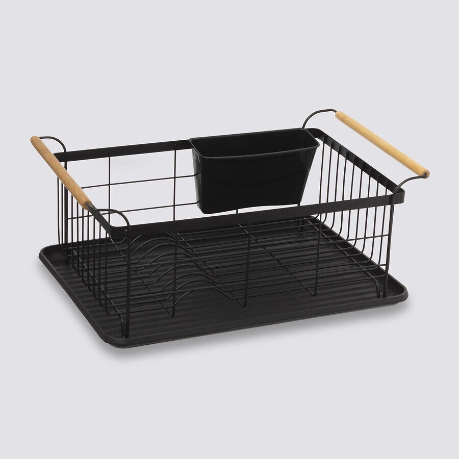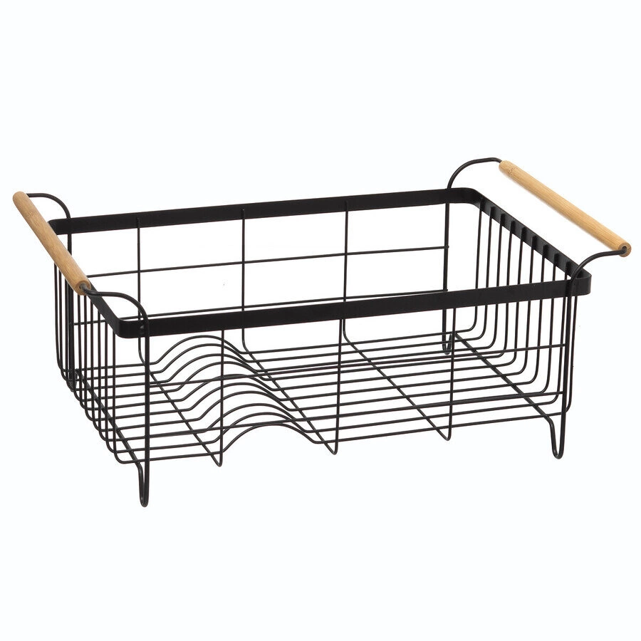 Ociekacz do naczyń czarny z drewnianym uchwytem 5five to stylowa i praktyczna suszarka na naczynia, która doskonale sprawdzi się na blacie każdej nowoczesnej kuchni. Wykonany z trwałego metalu i drewna kauczukowego, oferuje pojemność przy kompaktowych rozmiarach – szerokość 43 cm, głębokość 32 cm i wysokość 18,5 cm. Wyposażony w osobny pojemnik na sztućce, pozwala łatwo i wygodnie suszyć talerze, kubki oraz drobne akcesoria kuchenne.