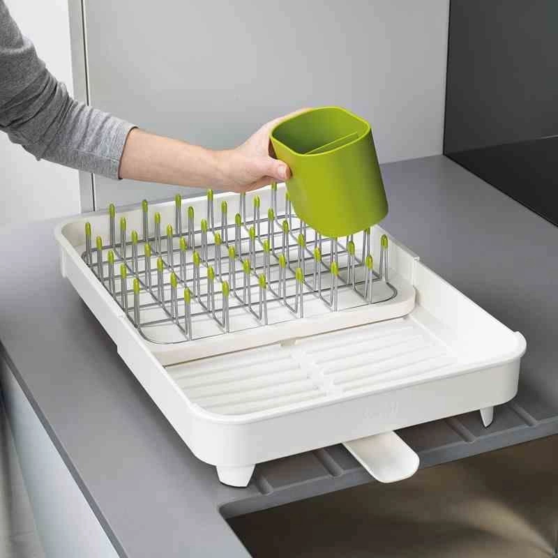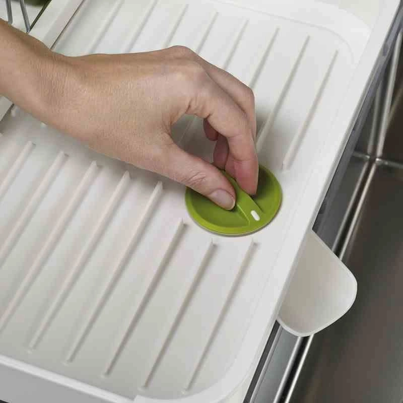 Ociekacz do zlewu Joseph Joseph Extend został wyposażony w praktyczny system odprowadzania wody, który umożliwia skierowanie jej bezpośrednio do zlewu lub zatrzymanie wewnątrz suszarki. W zestawie znajduje się wyjmowany pojemnik na sztućce, który można dowolnie przestawiać, aby ułatwić organizację przestrzeni. Dzięki specjalnie profilowanym żeberkom naczynia, kubki i miseczki schną szybciej, a woda nie gromadzi się pod spodem.