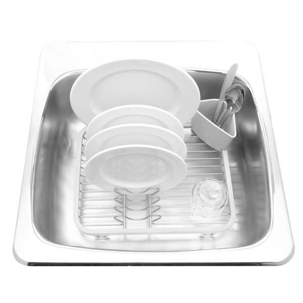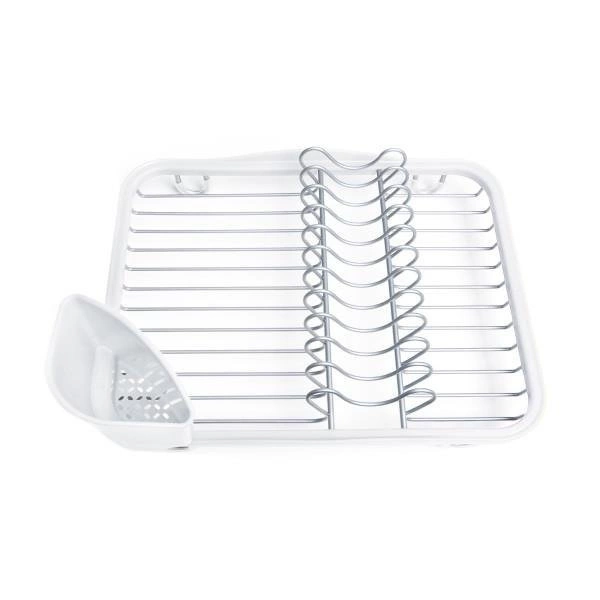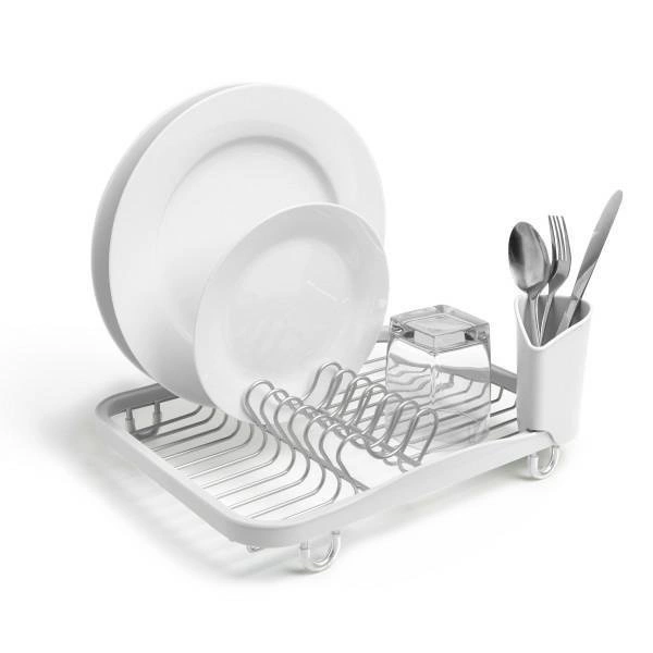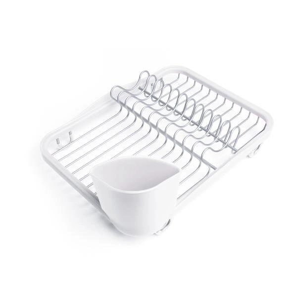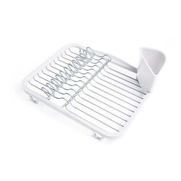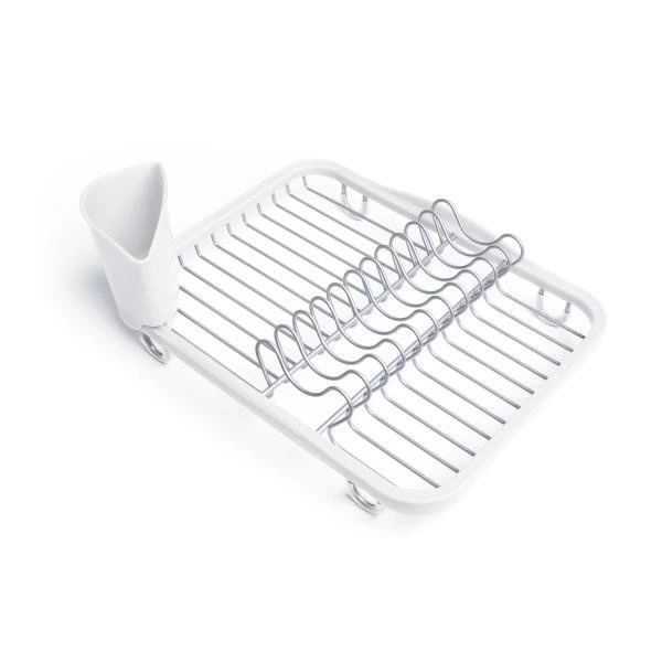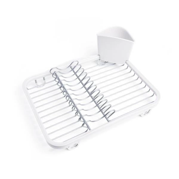 Ociekacz do naczyń na zlew i blat Sinkin marki Umbra to praktyczna i stylowa suszarka na naczynia, zaprojektowana z myślą o nowoczesnych kuchniach. Wykonany z trwałego metalu w białym kolorze oraz wysokiej jakości tworzywa sztucznego, zapewnia niezawodne wsparcie podczas codziennego zmywania. Dzięki kompaktowym wymiarom 36,5 × 27,9 × 13,3 cm, ten ociekacz do naczyń doskonale sprawdzi się zarówno na blacie, jak i umieszczony bezpośrednio w zlewie.