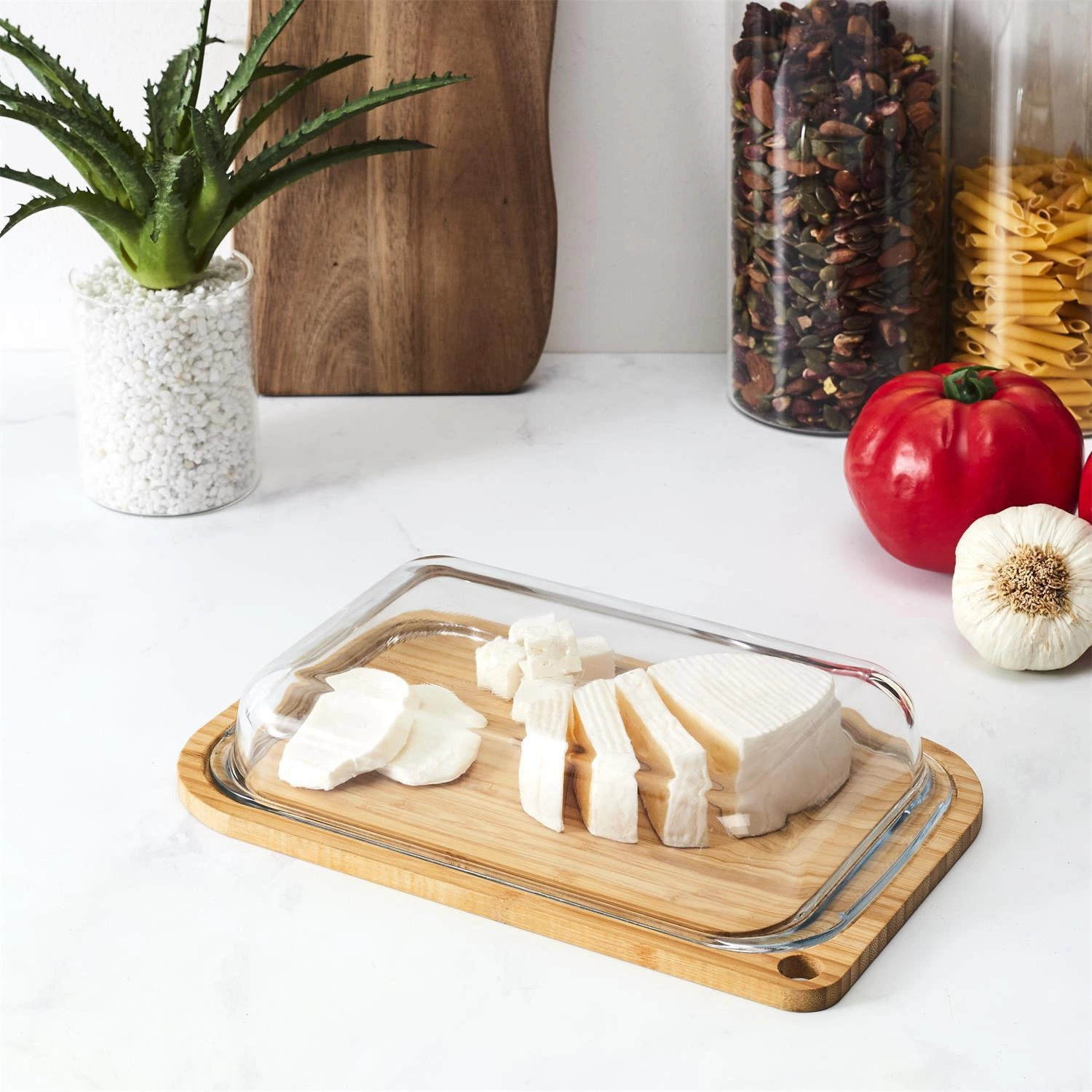 Pojemnik Clear składa się z deski bambusowej o szerokości 28 cm oraz pokrywki ze szkła. Jest to idealne rozwiązanie do przechowywania żywności takiej jak sery, wędliny czy owoce, co pozwala na zachowanie ich świeżości na dłużej.