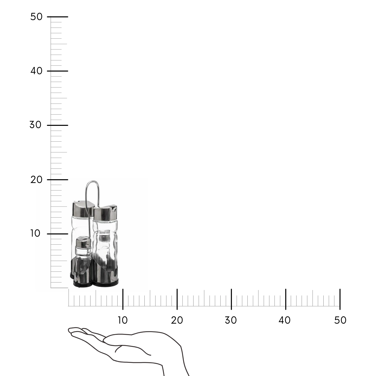 Zestaw 5five simply smart umożliwia przechowywanie oliwy z oliwek, octu, oleju oraz ulubionych przypraw w jednym, kompaktowym miejscu. Dzięki wymiarom 20 cm wysokości, 11,3 cm szerokości i 10,7 cm głębokości, stojak bez problemu zmieści się nawet na niewielkim blacie czy półce, nie zabierając cennej przestrzeni roboczej. Chromowane wykończenie sprawia, że zestaw prezentuje się wyjątkowo nowocześnie i subtelnie zarazem.