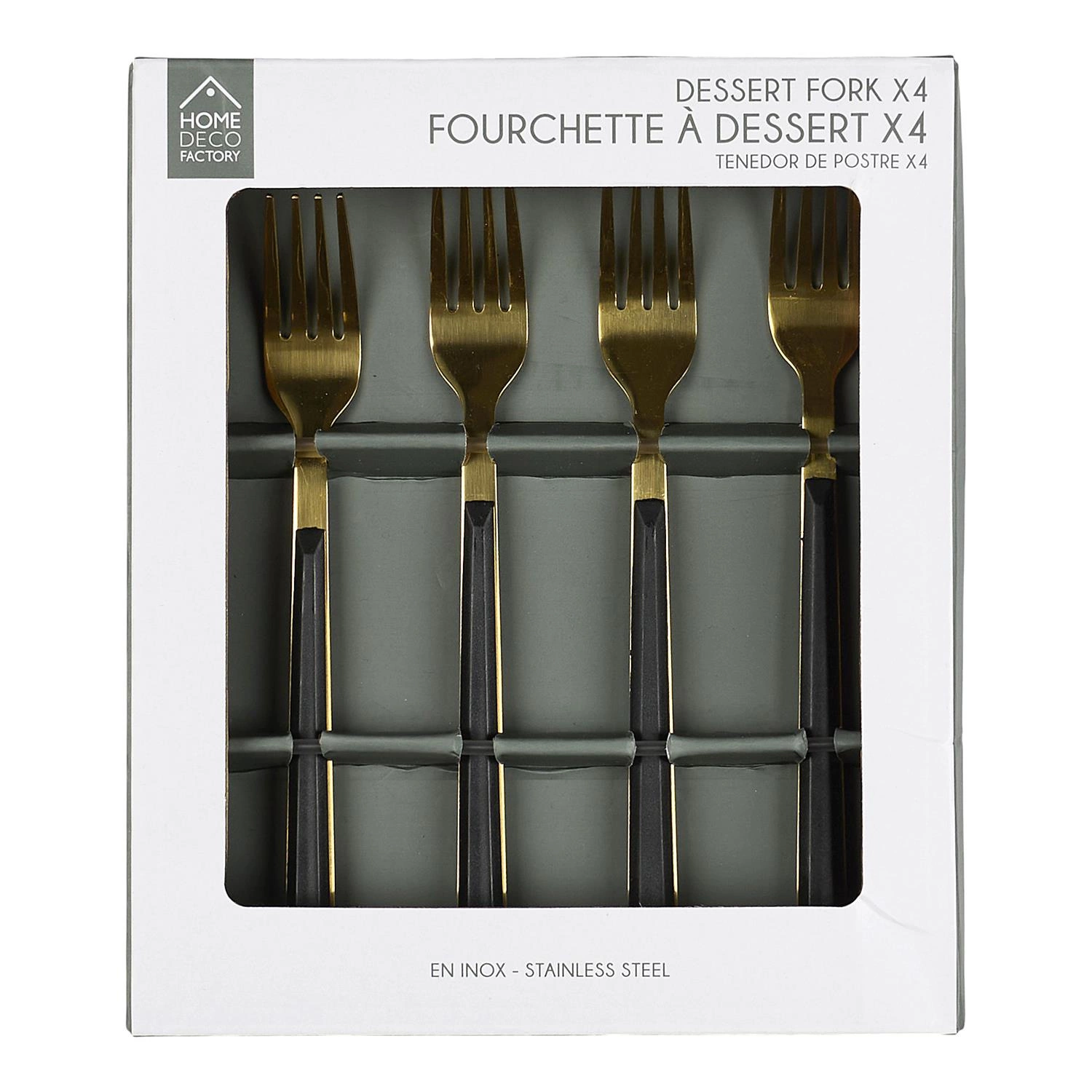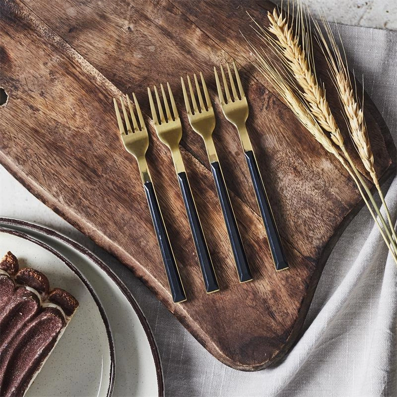 Charlotte Intesi to zestaw 4 złoto-czarnych widelczyków deserowych, który łączy w sobie elegancję oraz praktyczność. Każdy widelczyk został wykonany z solidnej stali nierdzewnej i wyposażony w wygodną, czarną rączkę z trwałego polipropylenu. Idealne do deserów, podkreślą wyjątkowy charakter każdego spotkania przy stole oraz codziennych chwil z ulubioną słodkością.