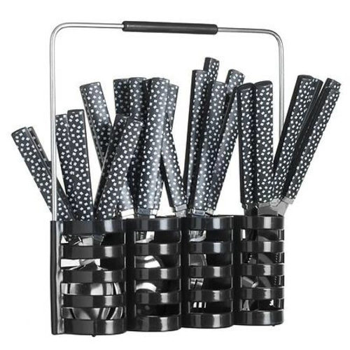 Komplet sztućców Géo to aż 24 elementy, które zaspokoją potrzeby domowników i gości. W zestawie znajdują się noże, widelce, łyżki stołowe oraz łyżeczki – wszystko, czego potrzebujesz do codziennych posiłków i przyjęć. Praktyczny stojak zapewnia łatwy dostęp do wszystkich akcesoriów i pozwala utrzymać porządek na stole lub w kuchni. Dobrze wyważone uchwyty gwarantują wygodne użytkowanie, a kompaktowy wymiar stojaka (wysokość 24,3 cm, szerokość 7 cm, głębokość 22,7 cm) sprawia, że bez trudu znajdziesz dla niego miejsce.