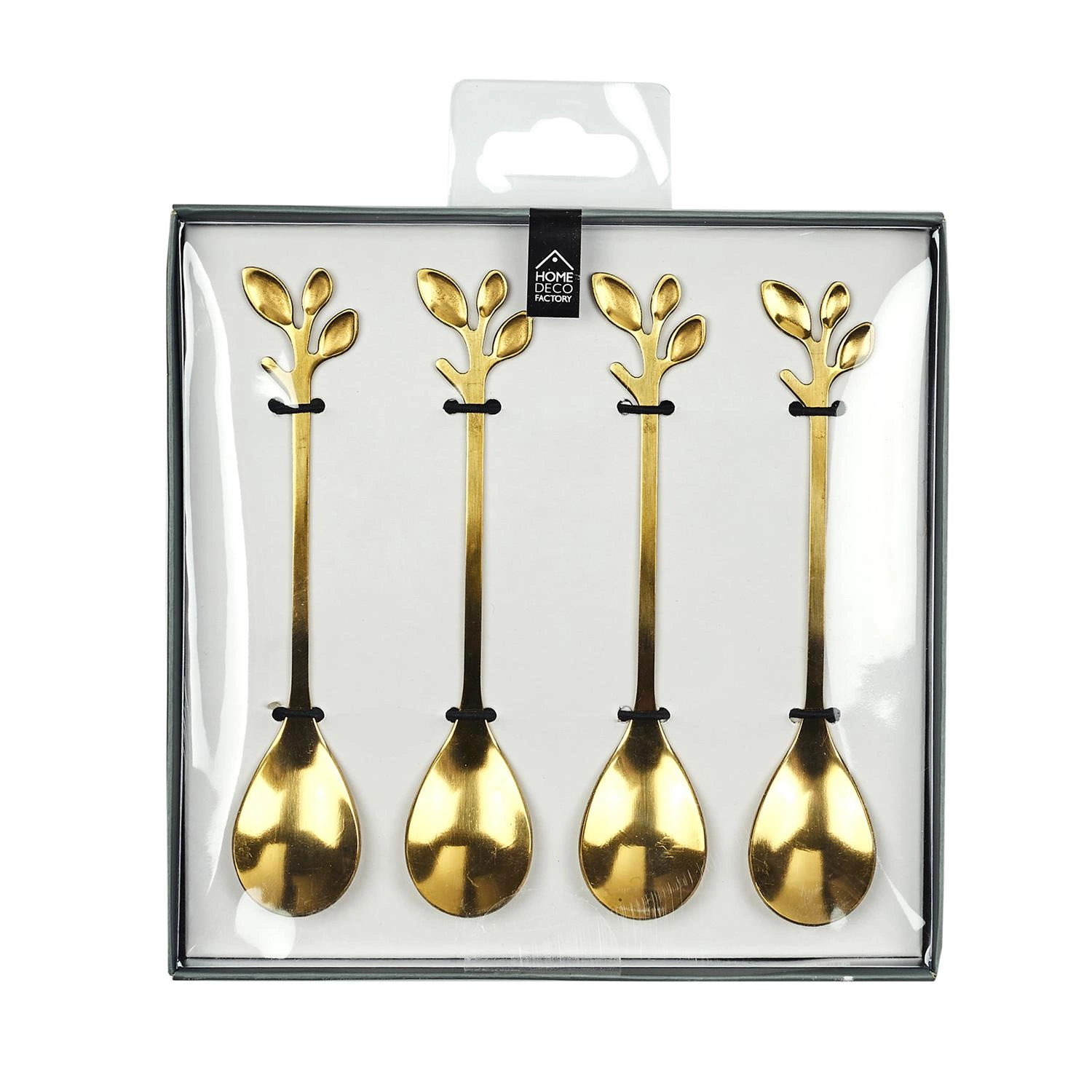 Zestaw sztućców do kawy Gold Leaf Intesi to propozycja dla miłośników niebanalnych dodatków do serwowania kawy. W skład kompletu wchodzą cztery złote łyżeczki wykonane z wysokogatunkowej stali nierdzewnej, które zachwycają eleganckim stylem glamour i precyzyjnym wykończeniem. Każda łyżeczka o szerokości 2,3 cm i głębokości 0,8 cm nie tylko efektownie prezentuje się na stole, ale też jest wygodna w codziennym użytkowaniu.