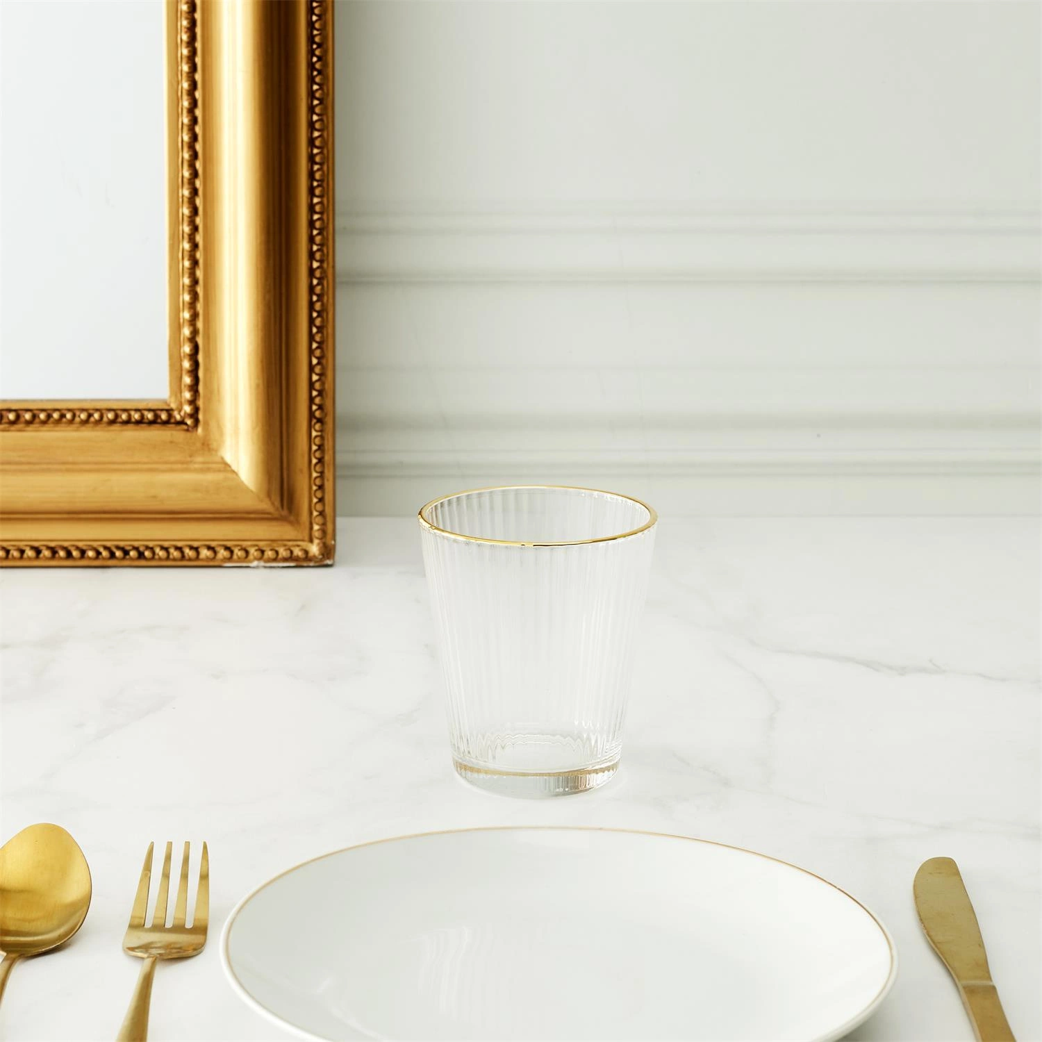 Szklanka do wody i drinków Gold Edge marki Intesi to eleganckie połączenie transparentnego szkła z wyrafinowaną złotą obwódką, które zachwyca stylem glamour i nowoczesnym charakterem. Pojemność 350 ml sprawia, że to idealny wybór zarówno do serwowania wody, soków, lemoniady, jak i wykwintnych drinków. Naczynie o wysokości 10,3 cm i szerokości 8,9 cm doskonale prezentuje się na stole, podkreślając wyjątkową oprawę każdej okazji.