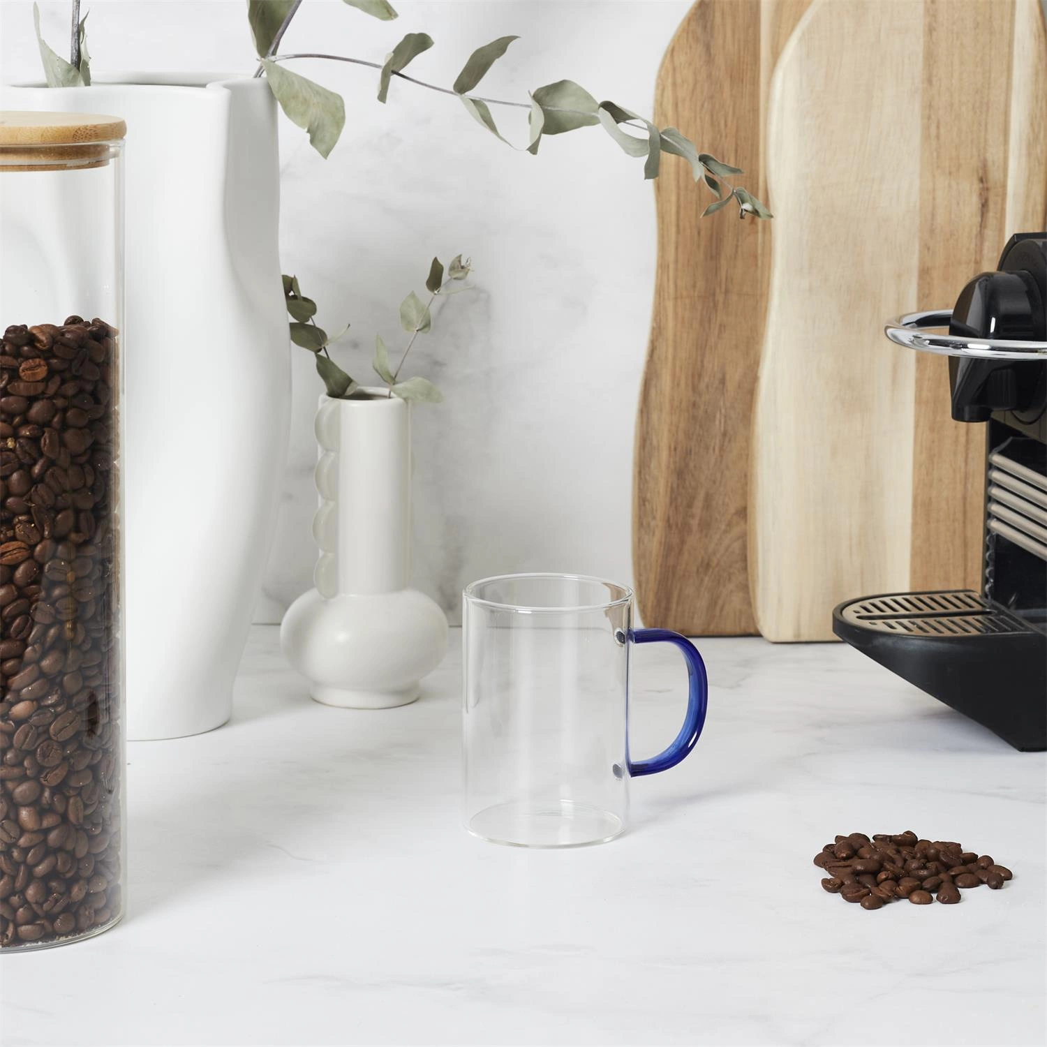 Intesi prezentuje elegancki i minimalistyczny kubek z niebieskim uchem, który wyróżnia się na tle innych naczyń. Wykonany ze szkła borowokrzemowego, który jest znany ze swojej wytrzymałości i eleganckiego wyglądu. Jego pojemność wynosi 300ml, co sprawia, że jest idealny na poranną kawę lub wieczorną herbatę. Dzięki temu, że jest zmywalny, codzienne użytkowanie staje się łatwiejsze i bardziej komfortowe.