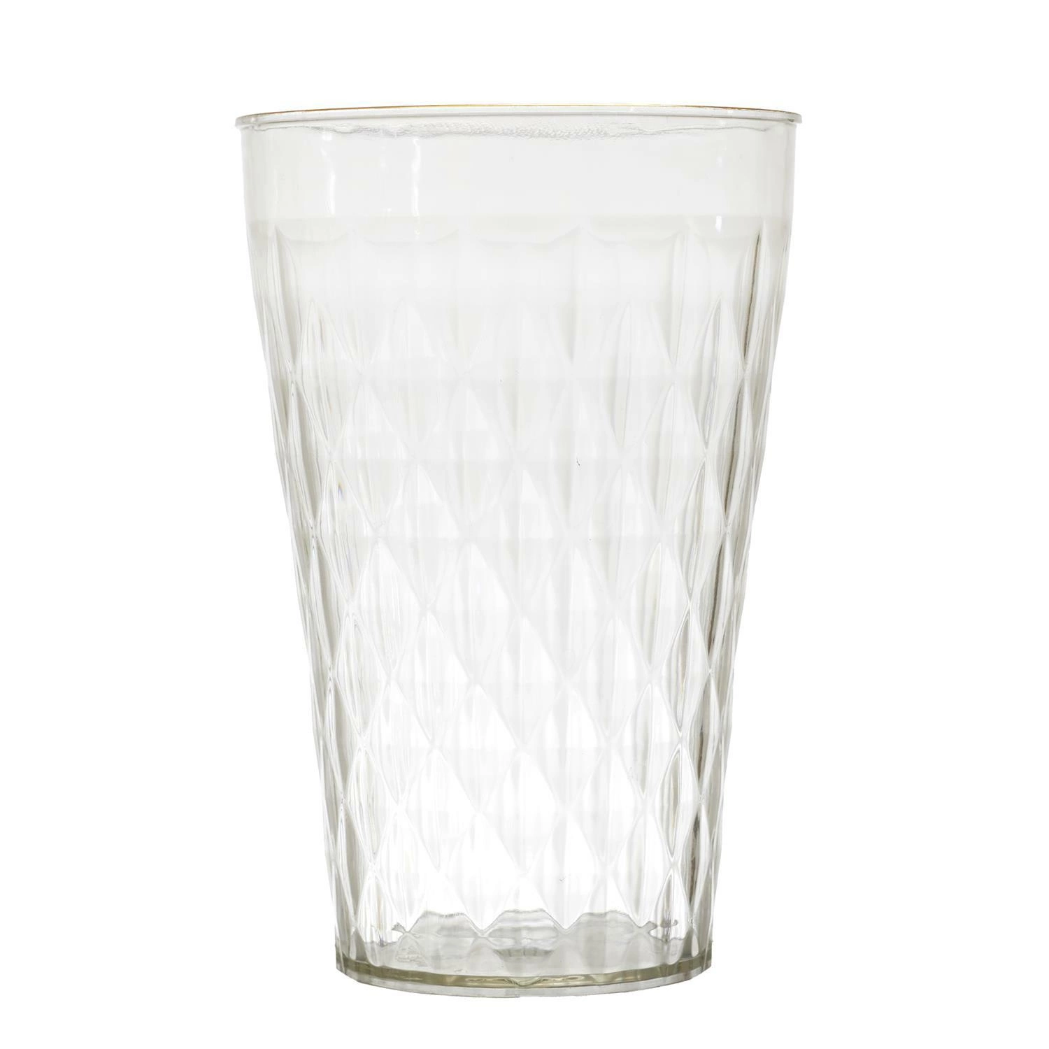 Szklanka Mirage marki Intesi to stylowe i praktyczne naczynie do napojów, wykonane z transparentnego tworzywa sztucznego z eleganckim złotym brzegiem. O wysokości 13,5 cm, szklanka doskonale sprawdzi się podczas serwowania wody, soków, koktajli czy napojów bezalkoholowych, a jej lekka konstrukcja zapewnia komfort użytkowania na co dzień i od święta. Trwały materiał PET czyni ją wytrzymałą i odporną na stłuczenia, a możliwość mycia w zmywarce gwarantuje łatwość utrzymania w czystości.
