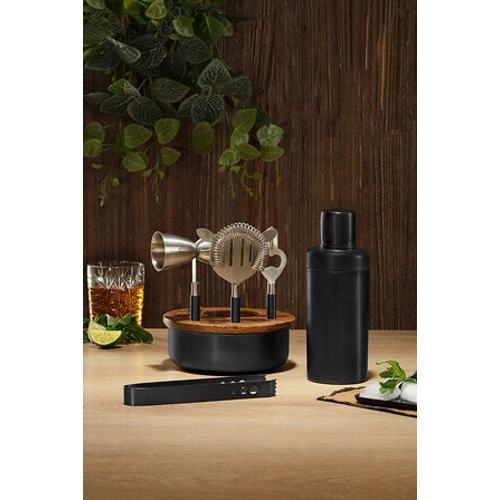 Ten elegancki zestaw do drinków w kolorze czarnym z elementami z drewna mango to idealne połączenie funkcjonalności i stylu. Wykonany z wysokiej jakości metalu i drewna mango, gwarantuje trwałość i wytrzymałość, nawet przy częstym użytkowaniu. Zestaw zawiera wszystko, co potrzebne do przygotowania ulubionych koktajli: szczypce do lodu, shaker, korkociąg, durszlak oraz dzbanek z miarką. Dzięki niemu, zarówno profesjonalny barman, jak i amator, będzie mógł cieszyć się przygotowywaniem drinków.
