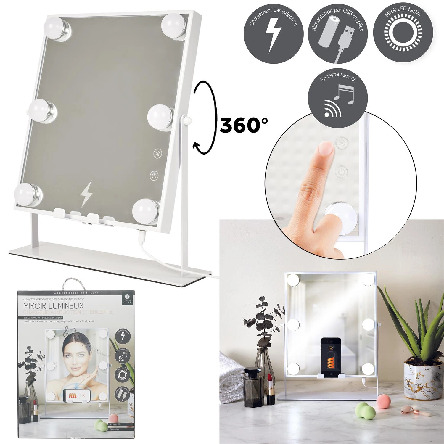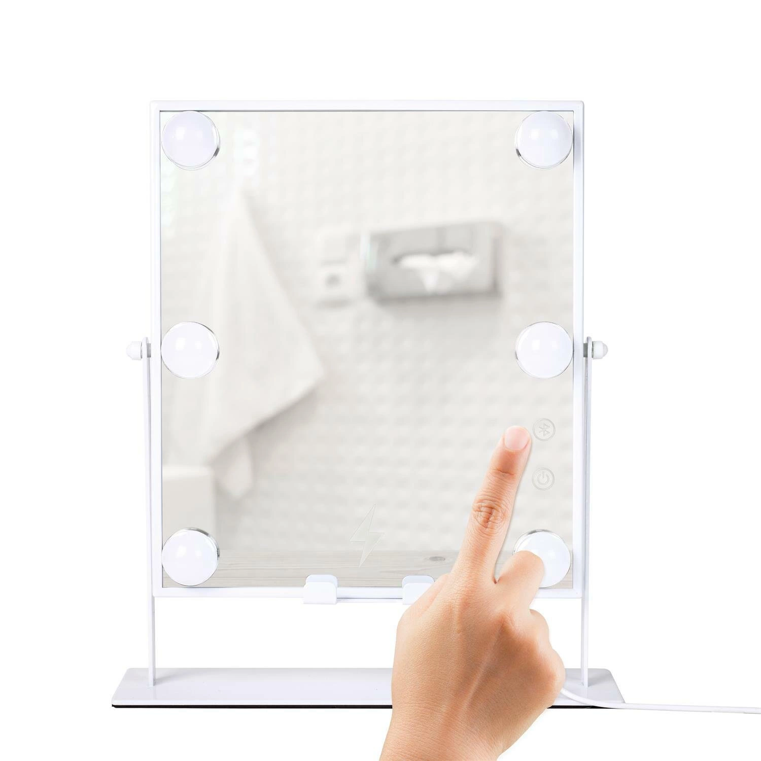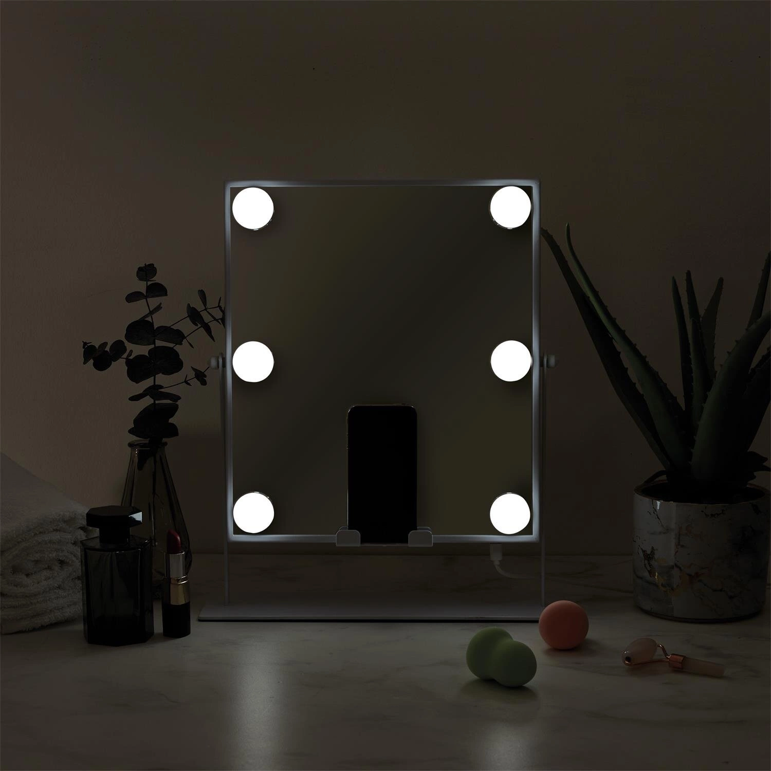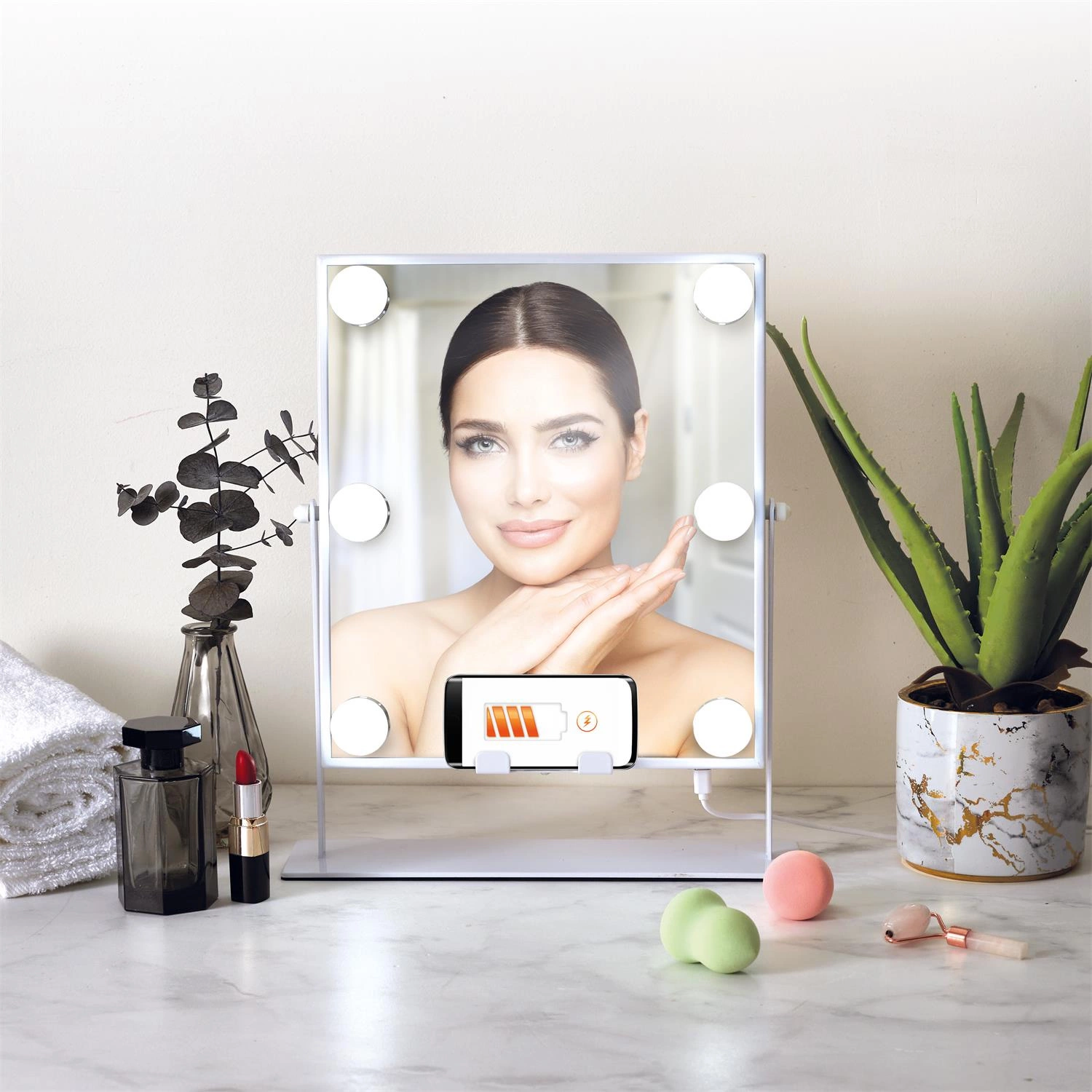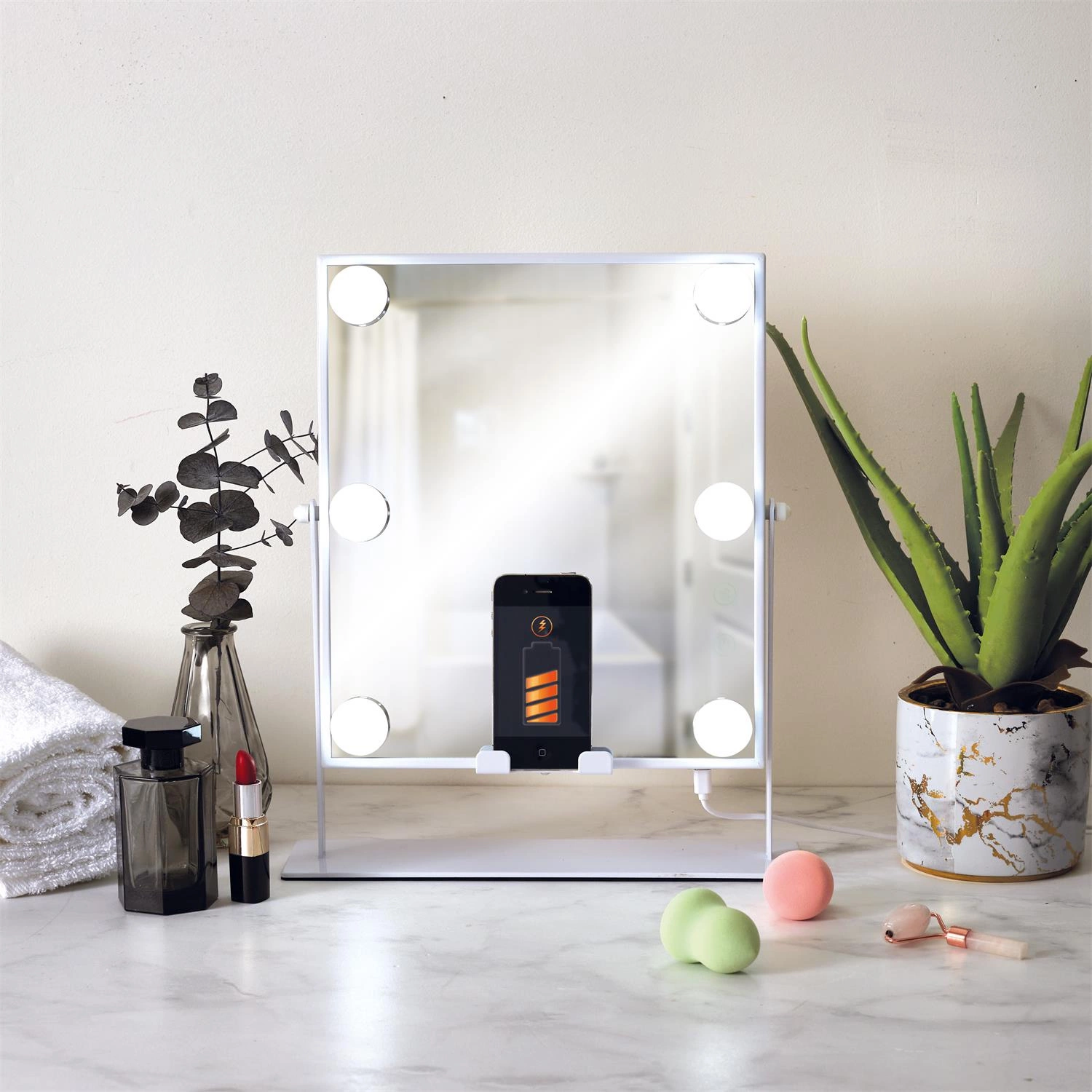 Lustro LED stojące do makijażu z głośnikiem i ładowarką Intesi to stylowy i nowoczesny dodatek, który zmieni Twoje codzienne rytuały pielęgnacyjne. Prostokątna tafla o wymiarach 36,7 × 31,8 cm została oprawiona w elegancką, białą metalową ramę, zapewniając doskonałą stabilność i trwałość. Lustro wyposażono w energooszczędne oświetlenie LED, głośnik Bluetooth oraz ładowarkę indukcyjną, co czyni je niezastąpionym elementem każdej toaletki, sypialni lub garderoby.