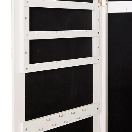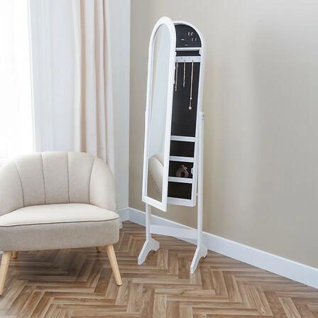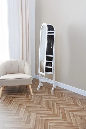 Lustro stojące Emily białe z organizerem na biżuterię do sypialni 145 cm Atmosphera to niezwykle funkcjonalny i stylowy element wyposażenia wnętrza. Prostokątne lustro o wysokości 158 cm i szerokości 38 cm, osadzone w eleganckiej białej ramie z płyty MDF, skrywa w swoim wnętrzu praktyczny schowek na biżuterię oraz drobne akcesoria. Ten model łączy w sobie wysoką estetykę wykonania z wygodą codziennego użytkowania, idealnie sprawdzając się w sypialni, garderobie lub przy toaletce.