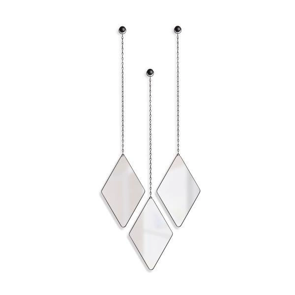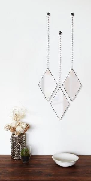 Szukasz pomysłu na dekorację ściany, jednak ramki z plakatami i zdjęciami nie przypadły Ci do gustu? Dima to rozwiązanie dla Ciebie! Jest to zestaw 3 luster w kształcie rombu, które nie tylko zapełnią pustą ścianę, ale także wprowadzą kreatywny akcent do aranżacji. Trzy wiszące romby to oddzielne elementy, które możesz ułożyć w dowolną kompozycję. Dzięki wygodnym haczykom z łatwością przybijesz je do każdej ściany, tworząc tym samym wyjątkową ozdobę. Dekoracja ścienna Dima to także idealny prezent dla wielbicieli dizajnu. Delikatne połączenie metalowej ramki na łańcuszku z lustrzaną powierzchnią to po prostu sposób na kreatywne wnętrze. Wszystkie lustra mają wymiary 28,7 × 17,7 × 1,6 cm.