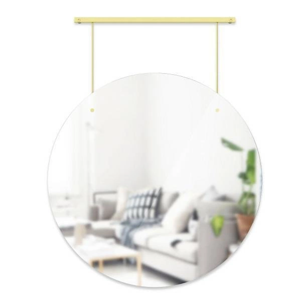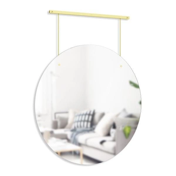 Delikatna, złota konstrukcja mocowania sprawia, że lustro Exhibit Umbra staje się nie tylko praktycznym elementem, ale również wyrazistą ozdobą ściany. Okrągły kształt optycznie powiększa pomieszczenie, dodając mu lekkości. To doskonały wybór, jeśli szukasz lustra w złotej ramie, które będzie centralnym punktem aranżacji w przedpokoju lub łazience utrzymanej w stylu glamour. Złote wykończenie subtelnie odbija światło, rozjaśniając nawet niewielkie wnętrza.