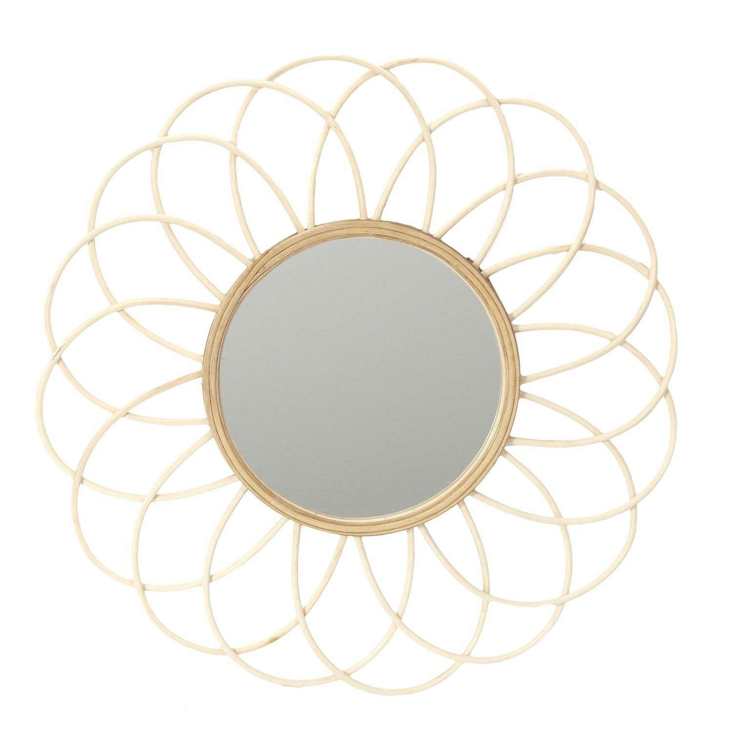 Rattanowe lustro Serifos jest stworzone z myślą o stylu boho. Zwierciadło o średnicy 22 cm otacza rama, która kształtem przypomina płatki kwiatu. Dzięki temu lustro wprowadzi do Twojego wnętrza powiew świeżości i letniej atmosfery. Pasuje do salonu, łazienki, sypialni czy przedpokoju.