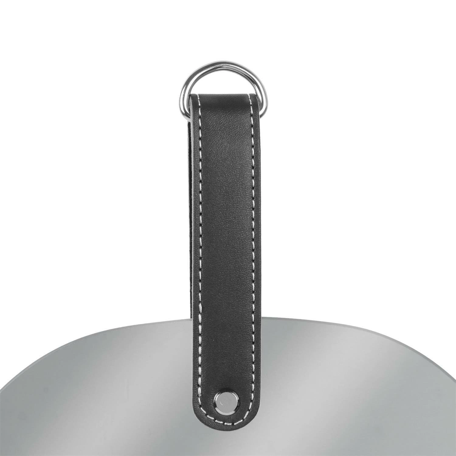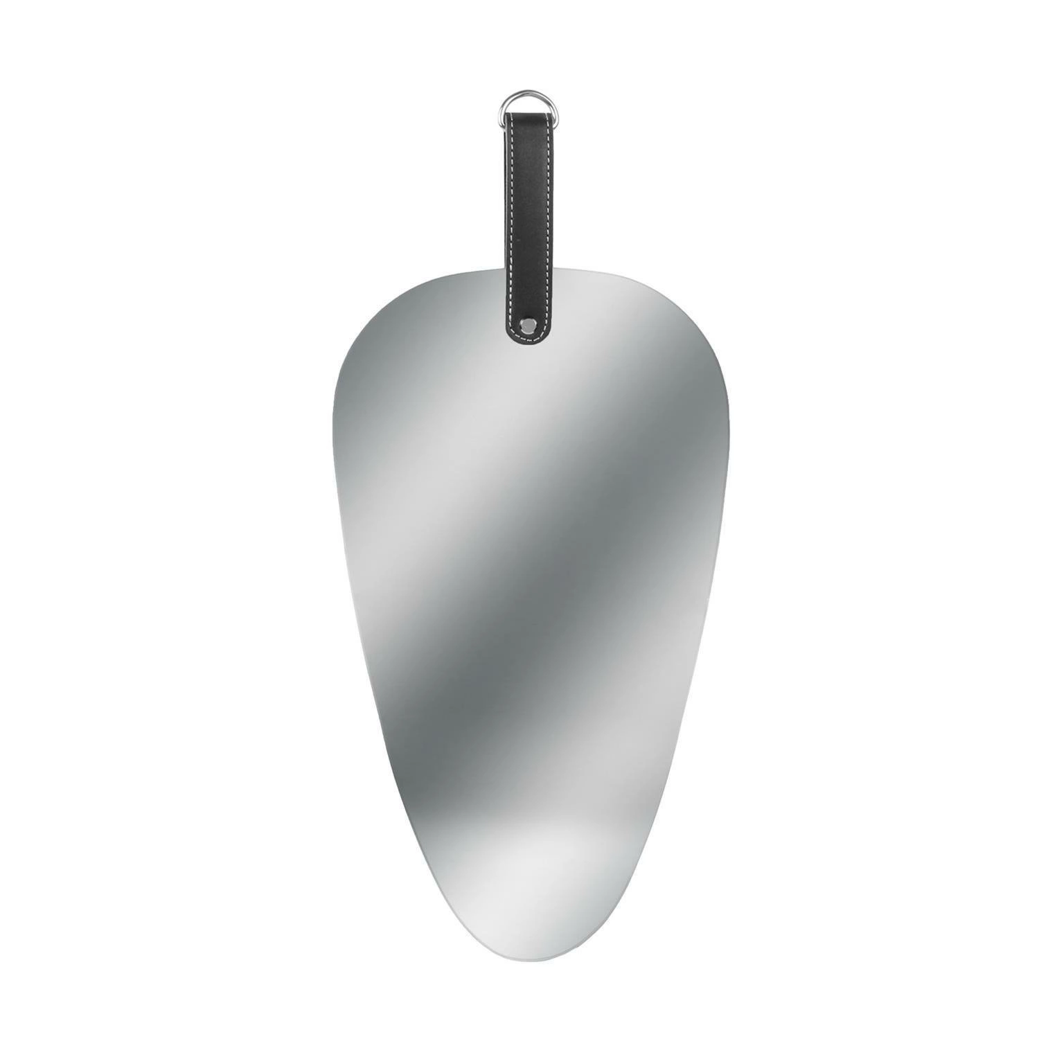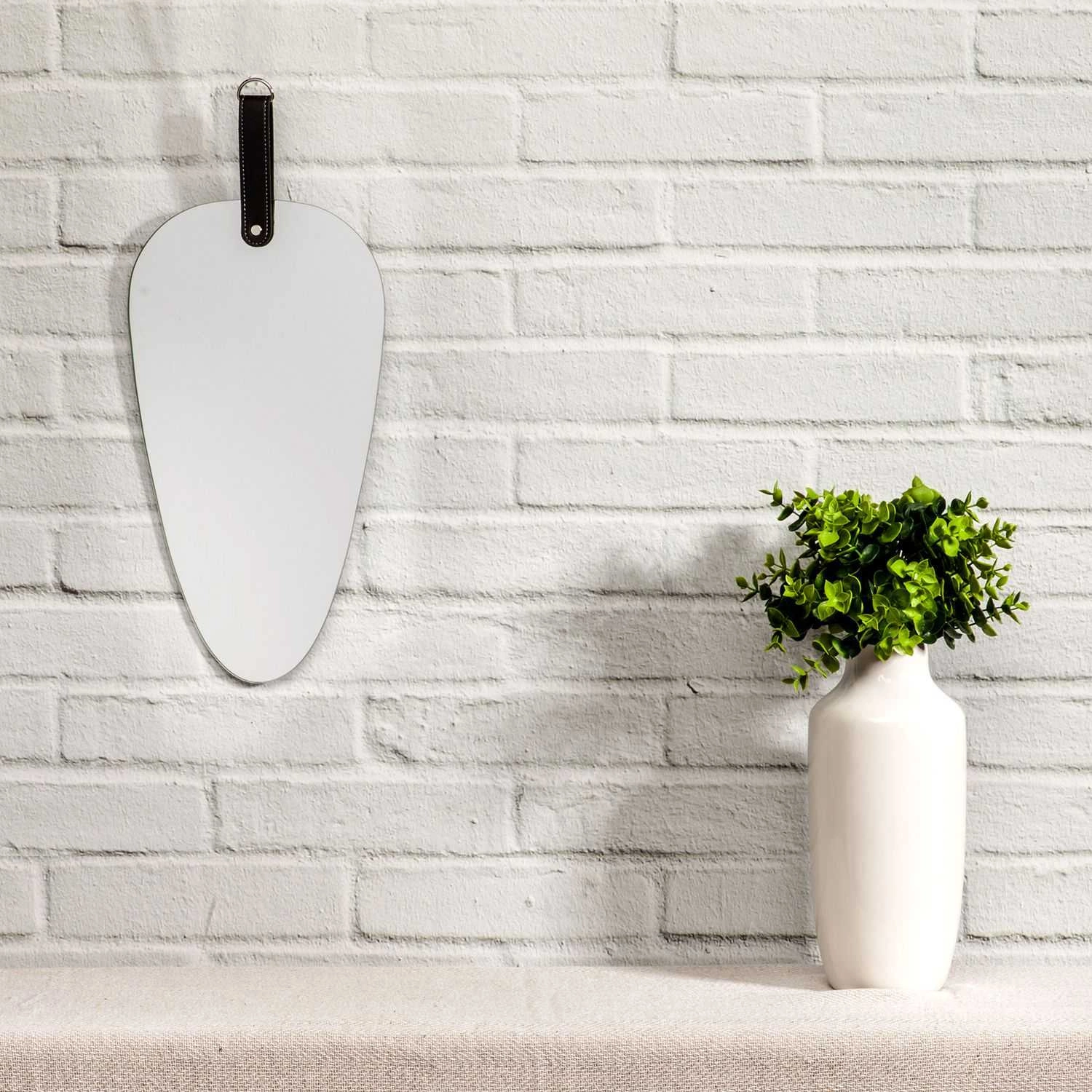 Lustro Pagaj jest bardzo modnym i efektownym dodatkiem. Lustro możemy zawiesić na ścianie dzięki uchwytowi zrobionemu z paska z eko skóry zakończonego stalowym uchwytem. Uchwyt został zamocowany do lusterka za pomocą nitu. Na pasku dodatkową ozdobą są jasne przeszynia. Lustro jest w kształcie przypominającym trójkąt z zaokrąglonymi rogami. Długość paska 13cm