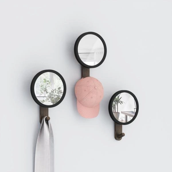 Lustro i wieszak HUB 2 w 1 to prosty i nowoczesny akcent na ścianę, zapewniający jednocześnie wszechstronną funkcjonalność. Wykonany z litego drewna wieszak Hub jest łatwym w użyciu rozwiązaniem do przechowywania. Maksymalne obciążenie haka to aż 2 kg. Samo lustro działa również jako dodatkowy haczyk. Czarna gumowa obręcz lustra zapewnia dodatkową trwałość i jest delikatna dla Twoich przedmiotów. Lustro Hub jest łatwe do zamontowania na ścianach. Zestaw do montażu lustra w zestawie.