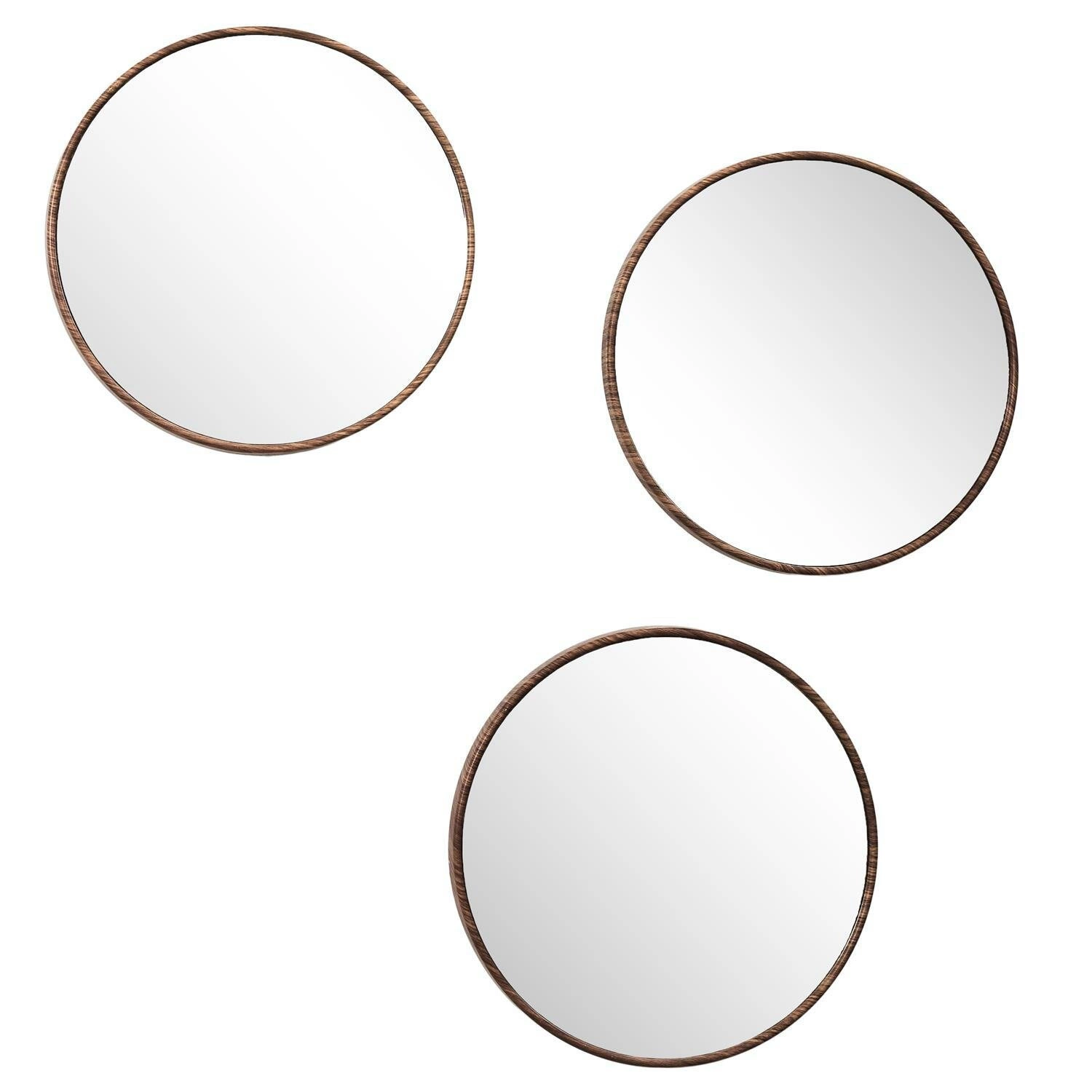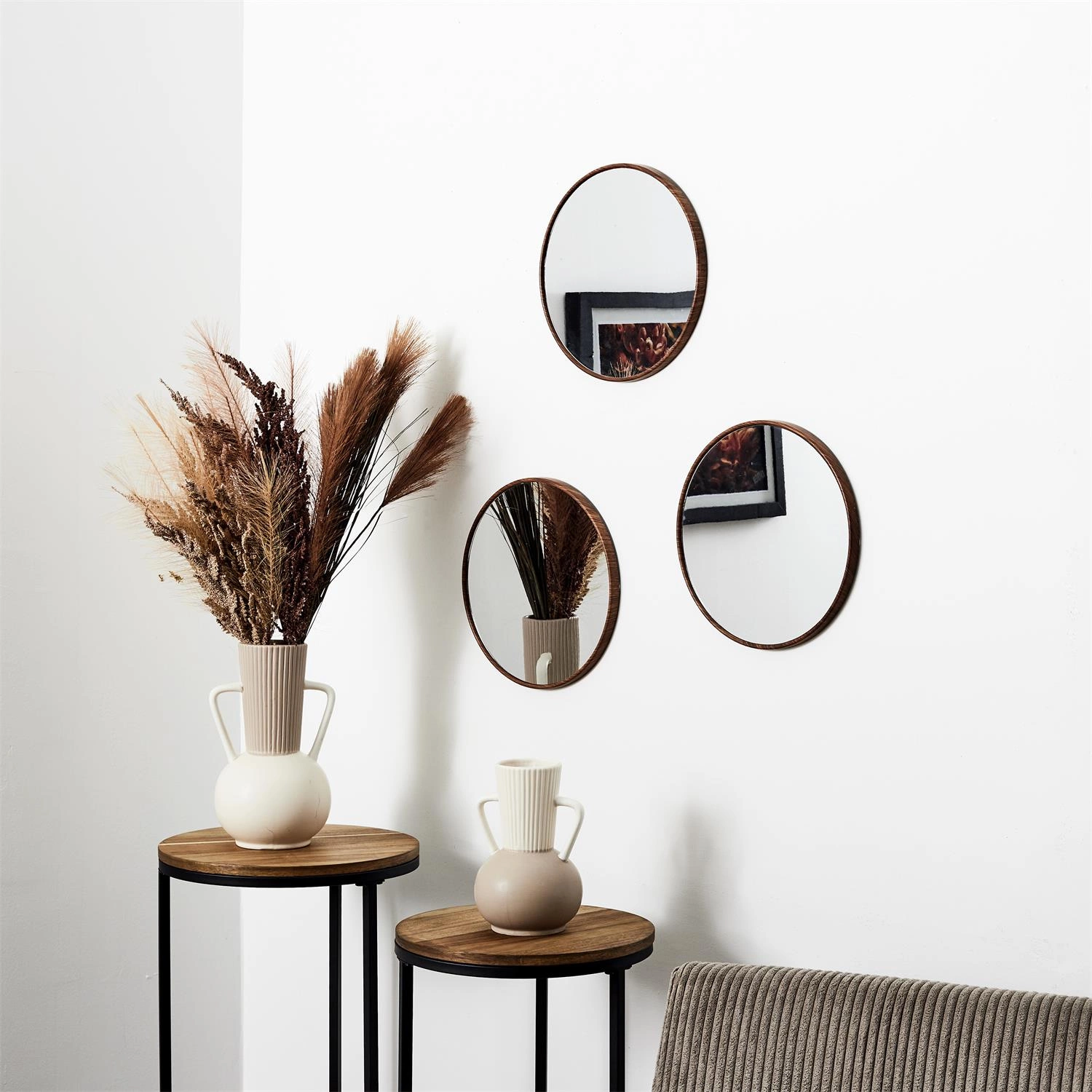 Zestaw 3 okrągłych luster wiszących Toronto orzech 26cm marki Intesi to funkcjonalna dekoracja ścienna, która łączy ponadczasową elegancję z praktycznym zastosowaniem. Każde lustro o średnicy 26 cm zostało oprawione w ramę imitującą szlachetne drewno orzechowe, dzięki czemu doskonale podkreśla charakter nowoczesnych i loftowych wnętrz. Zestaw został zaprojektowany z myślą o przedpokoju, salonie czy sypialni – wszędzie tam, gdzie chcesz optycznie powiększyć przestrzeń i dodać jej stylowego akcentu.