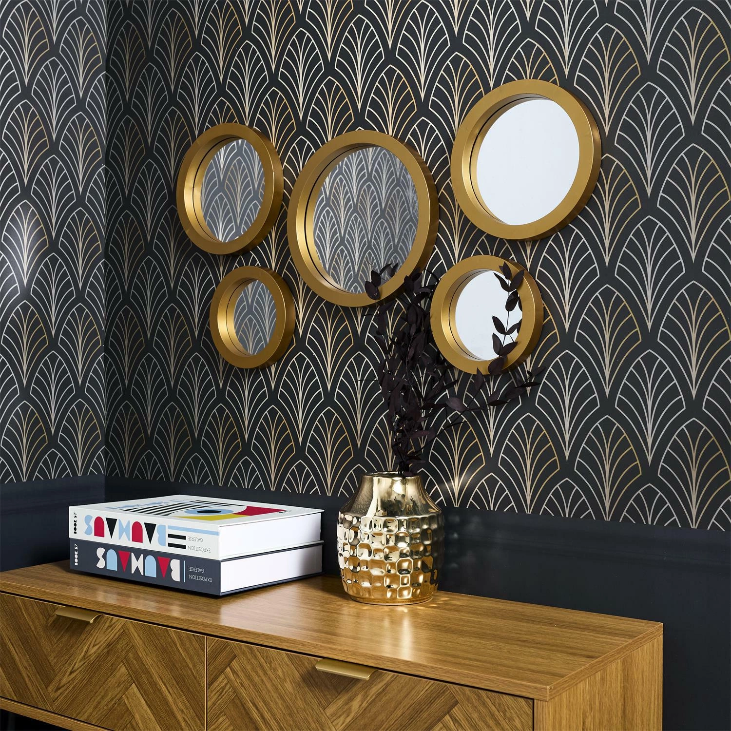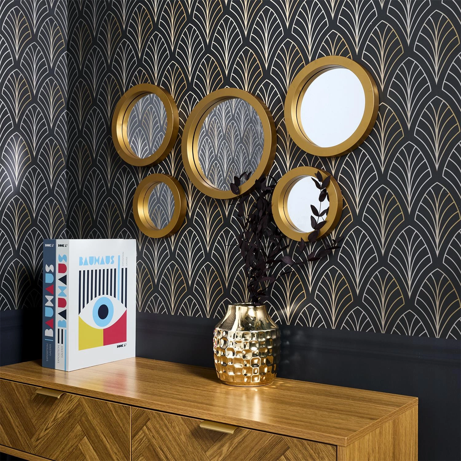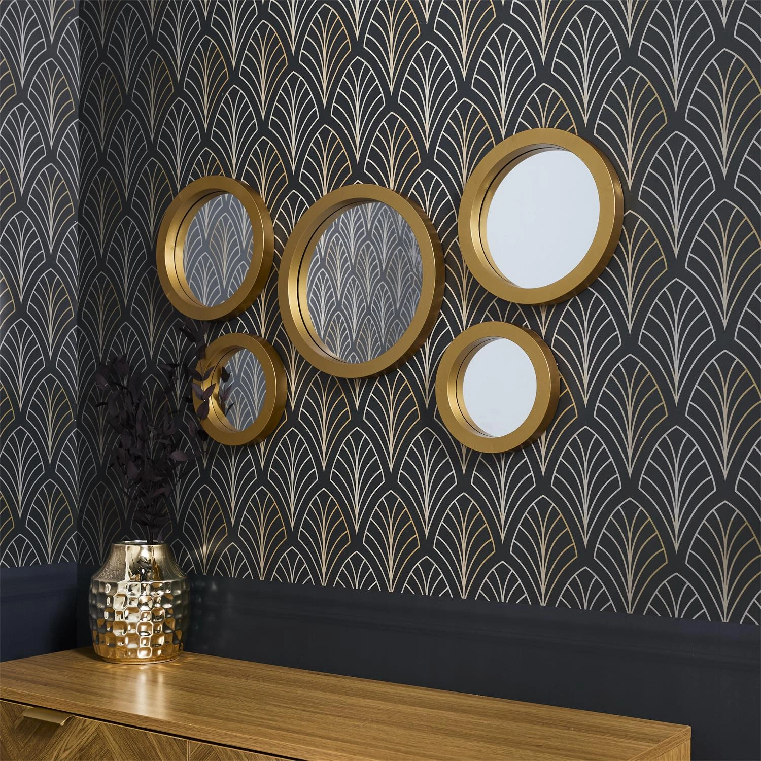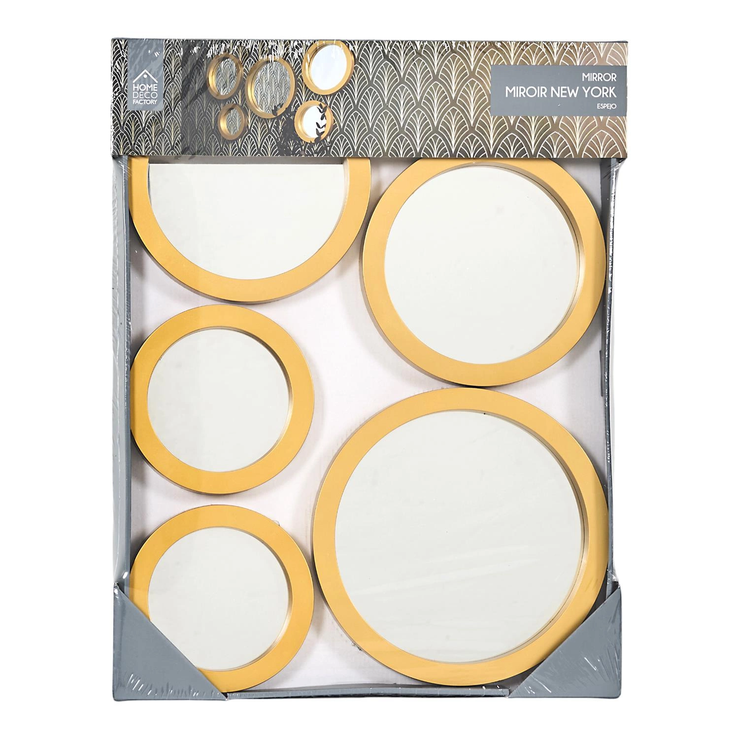 Zestaw 5 luster o organicznych kształtach. Wykonane z tworzywa sztucznego ramki w kolorze złotym dodają nowczesnego i ponadczasowego wyglądu. Tafla luster wykonana ze szkła. Tył luster wyposazony został w uniwersalny zaczep, który pozwala powiesić lustra w pionie jak i w poziomie.