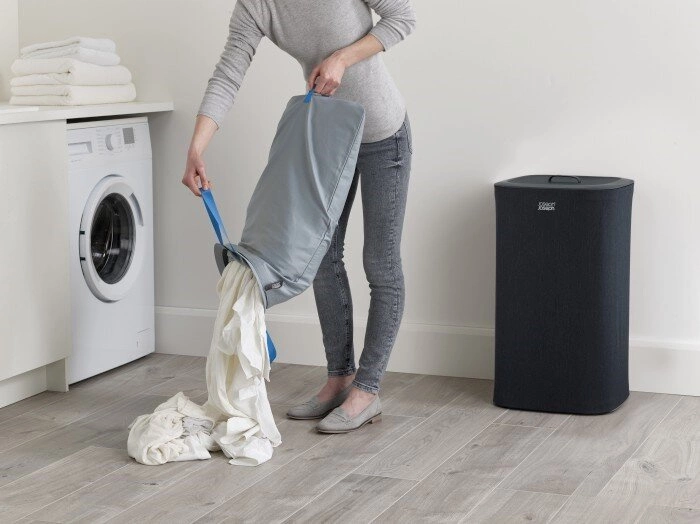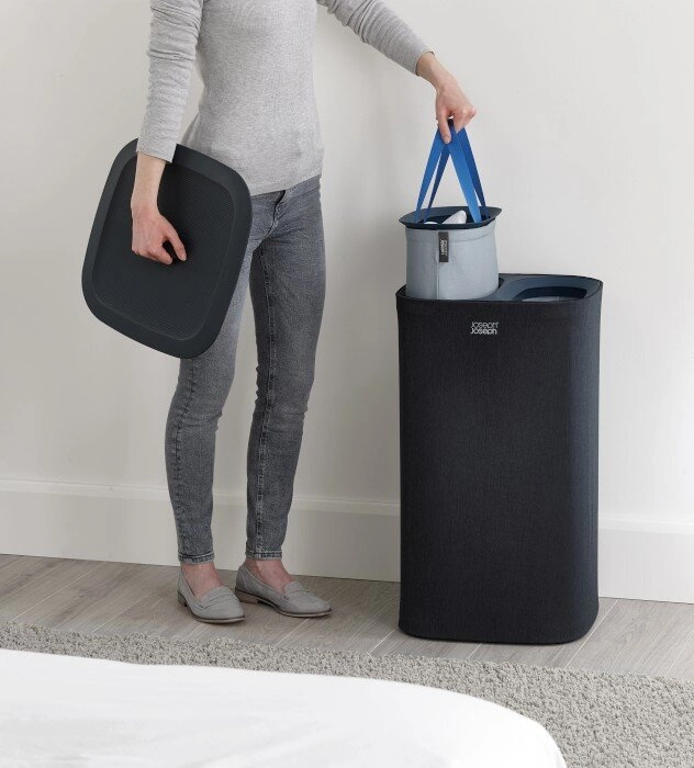 Projektanci marki Joseph Joseph postawili na minimalistyczny, nowoczesny design i uniwersalny czarny kolor, który wpasuje się w każde wnętrze. Praktyczność kosza podkreśla możliwość prania worków w pralce, co znacznie ułatwia utrzymanie ich w czystości. Dwa uchwyty na górze i na dole worków sprawiają, że przenoszenie prania nigdy nie było tak proste.