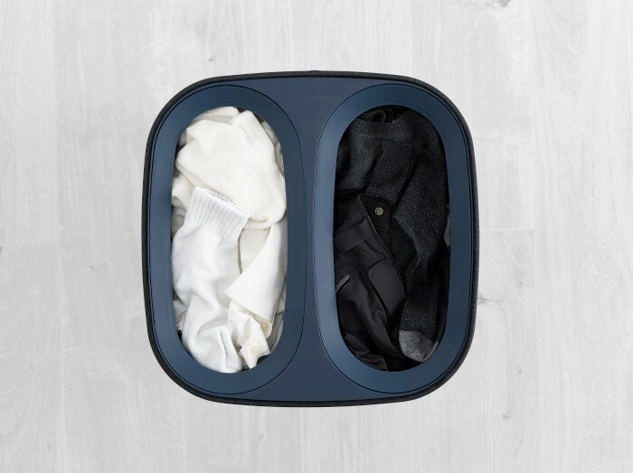 - Oferuje aż 60l pojemności, podzielonej na dwie komory, co pozwala na wygodne segregowanie prania.
